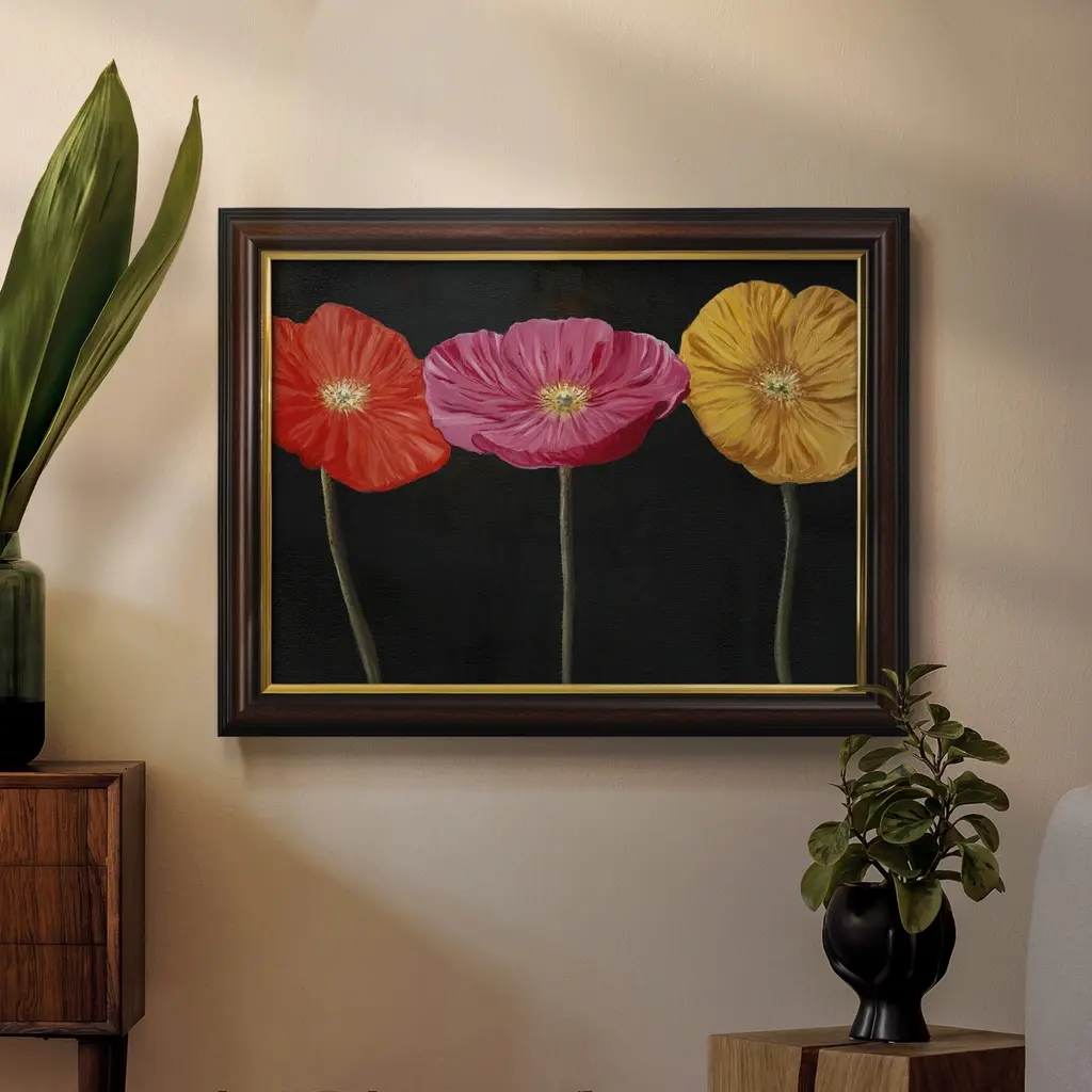 Poppy Trio II Premium Framed Canvas- Ready to Hang A Premium Framed Canvas created to last. Framed in distressed wood and available in an array of sizes and colors Featuring a beveled a solid wood stretcher bar, each piece comes ready to hand 3 SIZES AVAILABLE 16''X20'' - Overall Size 18'X27'' - Overall Size 24''x36'' - Overall Size Each piece is made to order. Each piece comes with hanging hardware. Made in the USA Ready to Hang Giclee Paper Print Acrylic Glass Beveled Matt Board
