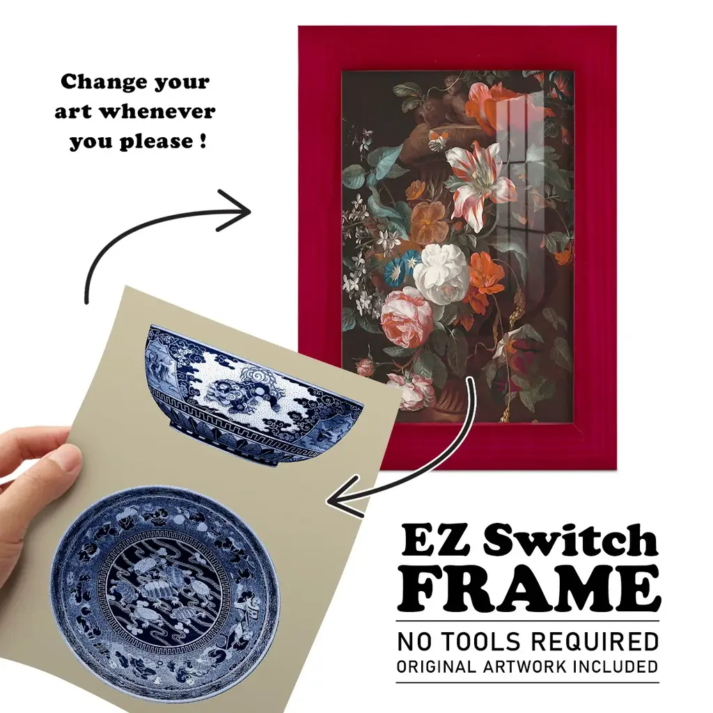 Porcelain in Blue and White I -EZ SWITCH Framed Print w/glass-Cherry Red A delightful, framed print. Featuring a solid wood frame with real wood glass. This premium print is giclee quality. In addition, every frame features a removable back and table top stand. This allows you to change your art in the future or to just stand the art on a table for a new look. We are sure you'll enjoy our new series of EZ SWITCH Framed Art. Solid Wood Frame Real Glass Removable / Replaceable Art Built in Tabletop Stand Sizes range from 4x6 up to 12x15 - buy just one or pair them up as sets as you see fit.