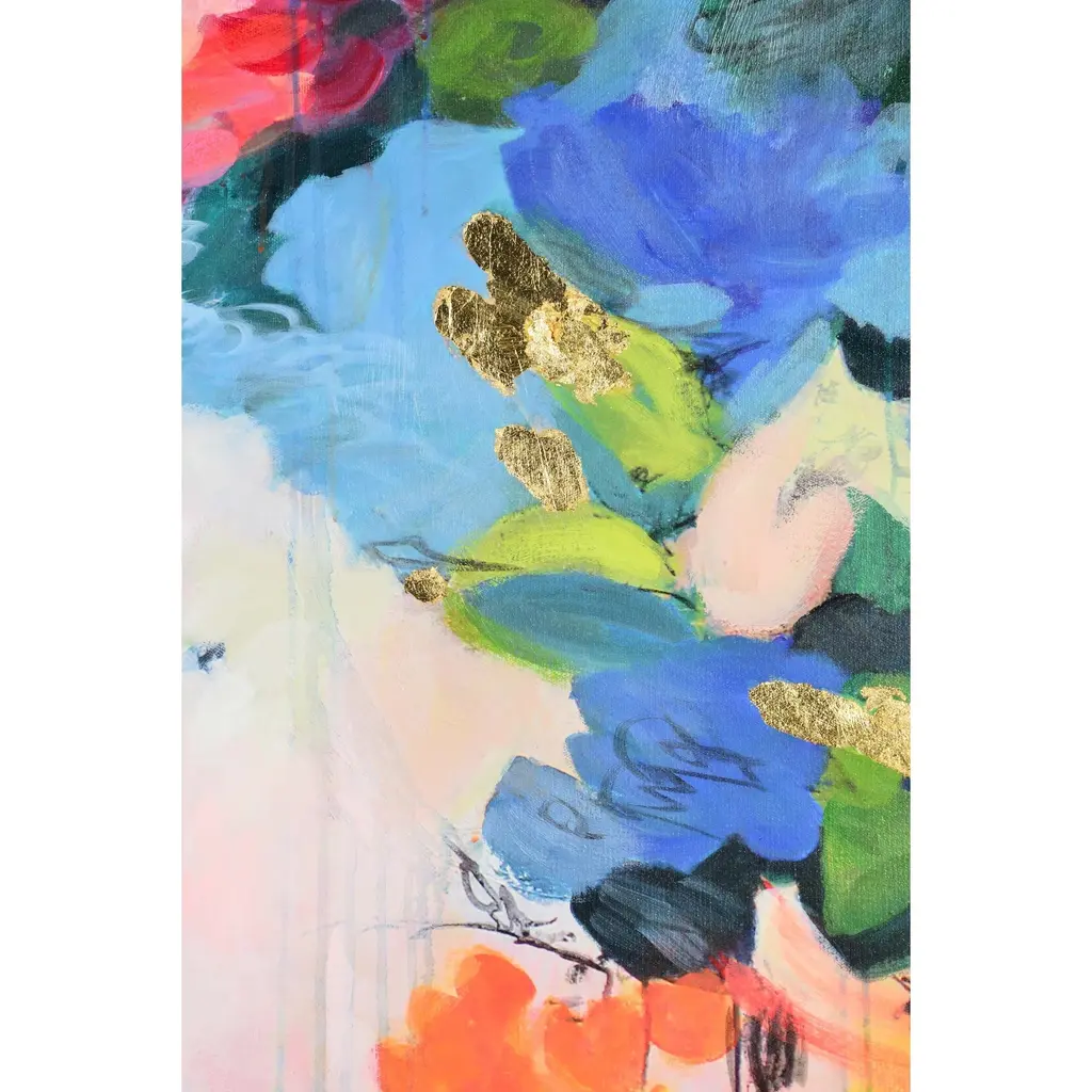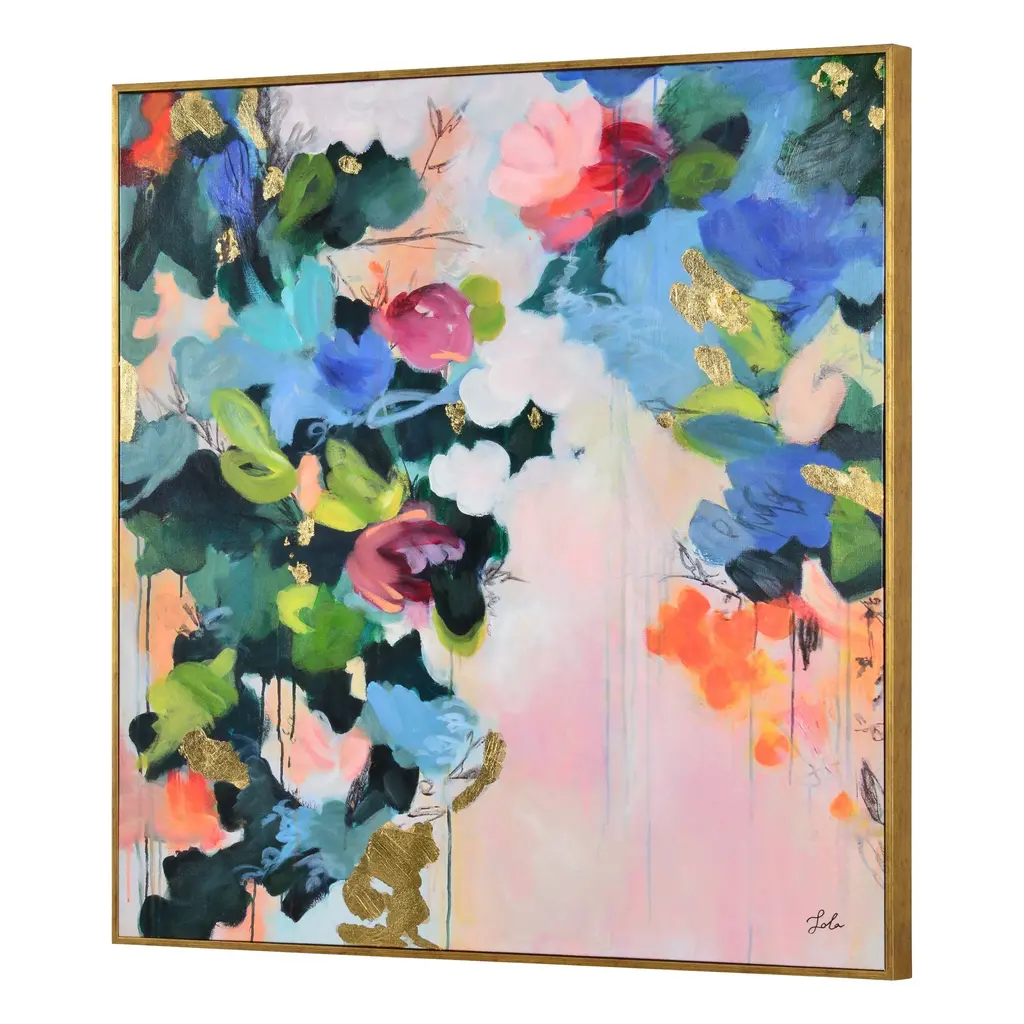 Amplify interior walls with the abstract composition of this modern painting on canvas. Hand-painted brushstrokes suggest a blossoming floral arrangement, with swirls of pigment in shades of pink, fiery orange, verdant green and blue that are bold and brilliant. Framed in antique gold, this fine art piece turns up the volume on traditional floral motifs, creating a vibrant wall art piece for rooms that live out loud.
