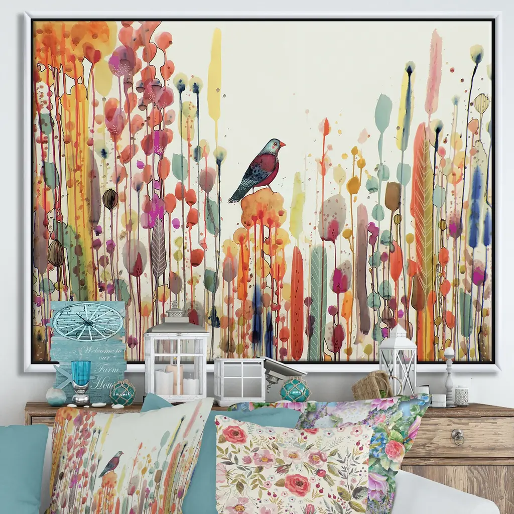Lend a touch of fresh whimsy to your decor with this beautiful 'Joie De Vivre' canvas wall art from Porch & Den. The beautiful design features a brightly colored background of stylized leaves and flowers, with a bird perched in the center. The lively piece is printed with high-quality inks on stretched canvas, then mounted inside a wood floating frame, available in your choice of white or black finish.Features:Titled 'Joie De Vivre'Giclee canvas printPremium quality cotton canvasHigh-quality, fade-resistant inksWood floating frameFrame available in black or whiteEasy to hangOption Dimensions:40 inches wide x 30 inches high46 inches wide x 36 inches high