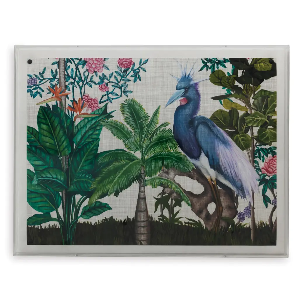 Whimsical and tropical, the Port 68 Paradise IV art features a giclée print mounted under a 2.5" deep Lucite® shadow box. Attached to a linen wrapped interior panel, the artwork is finished with black nail head in each corner.