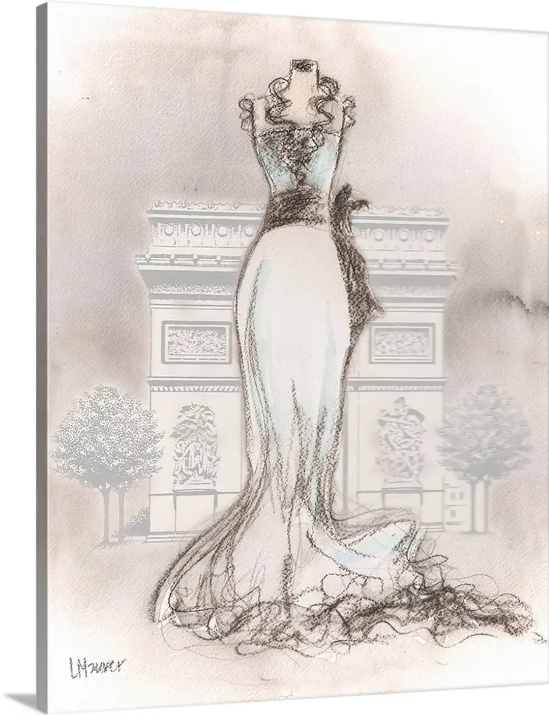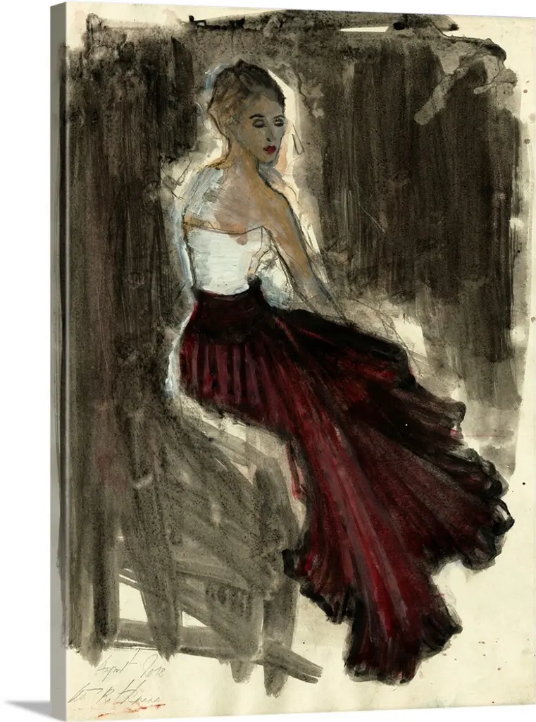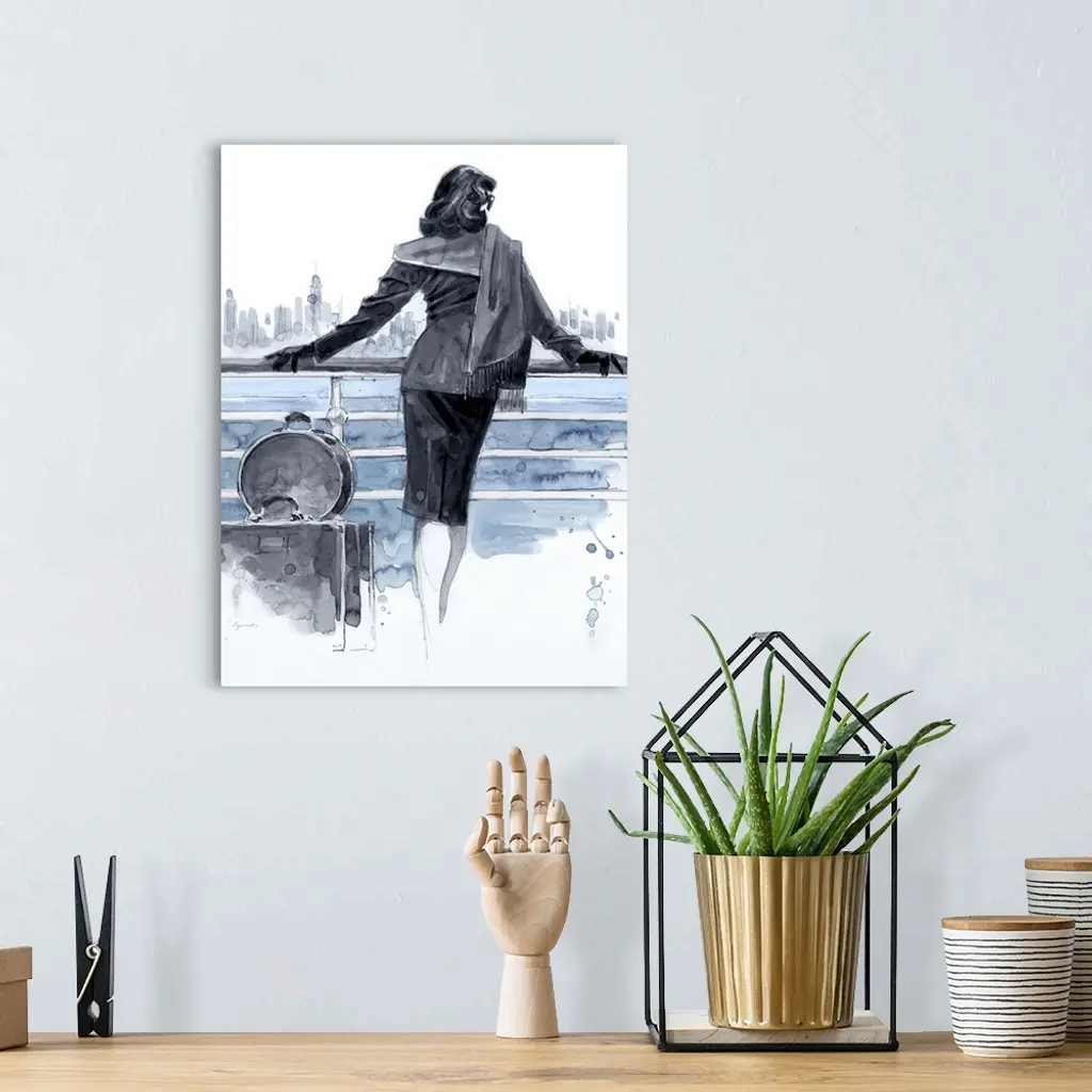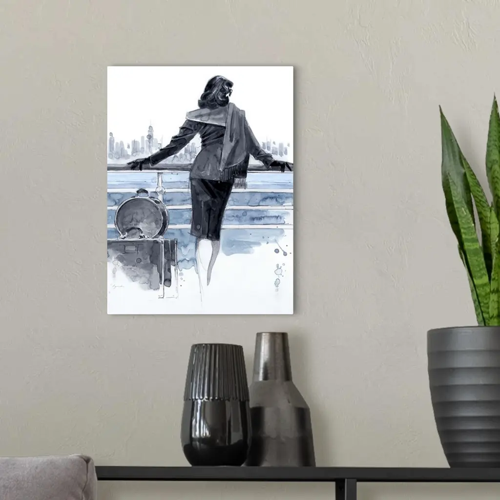 Contemporary painting of a woman standing in front of a railing on a ship, looking out at a city skyline.