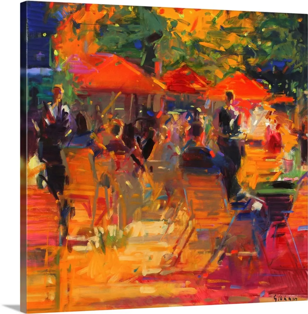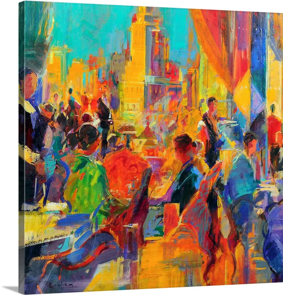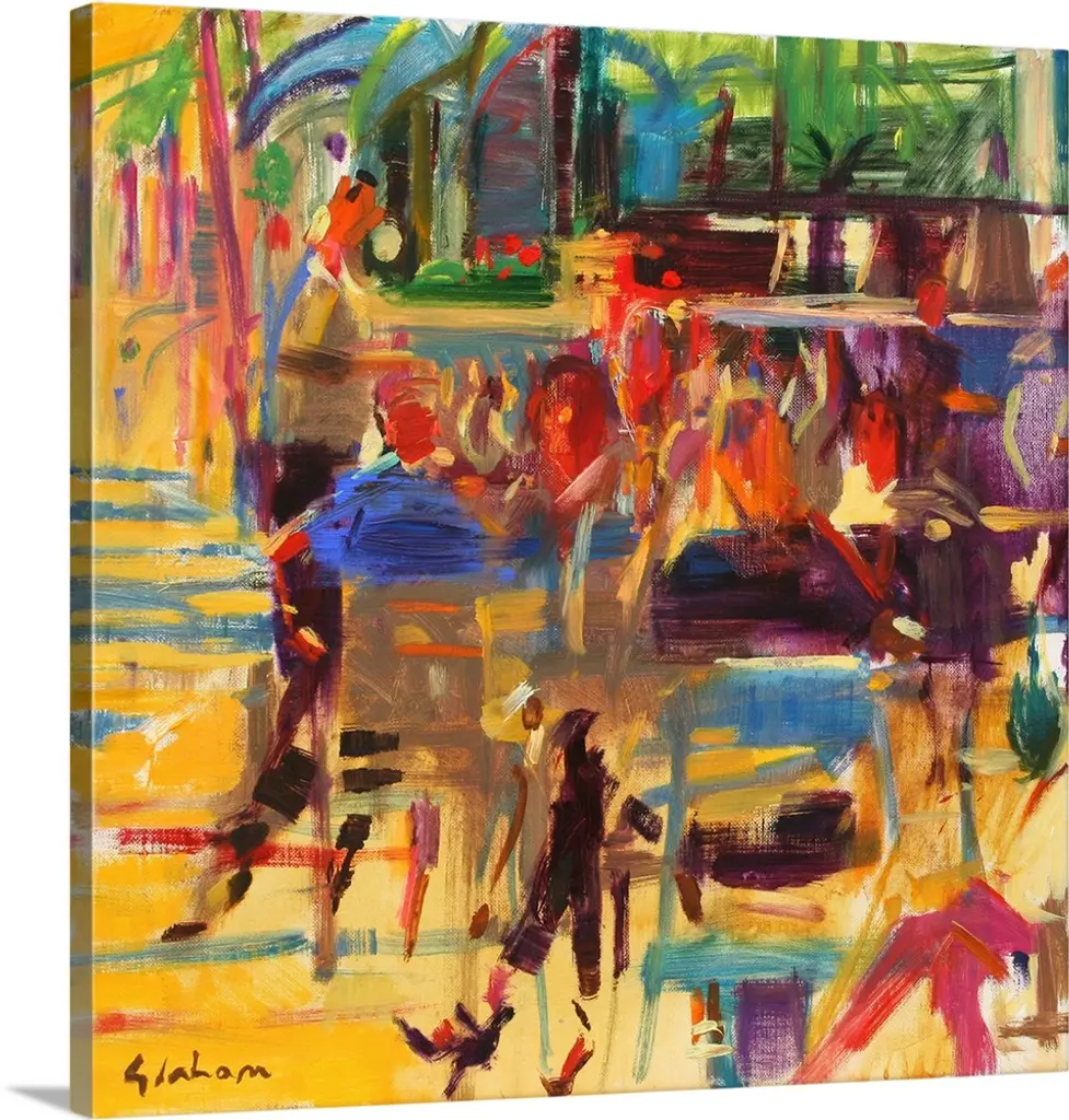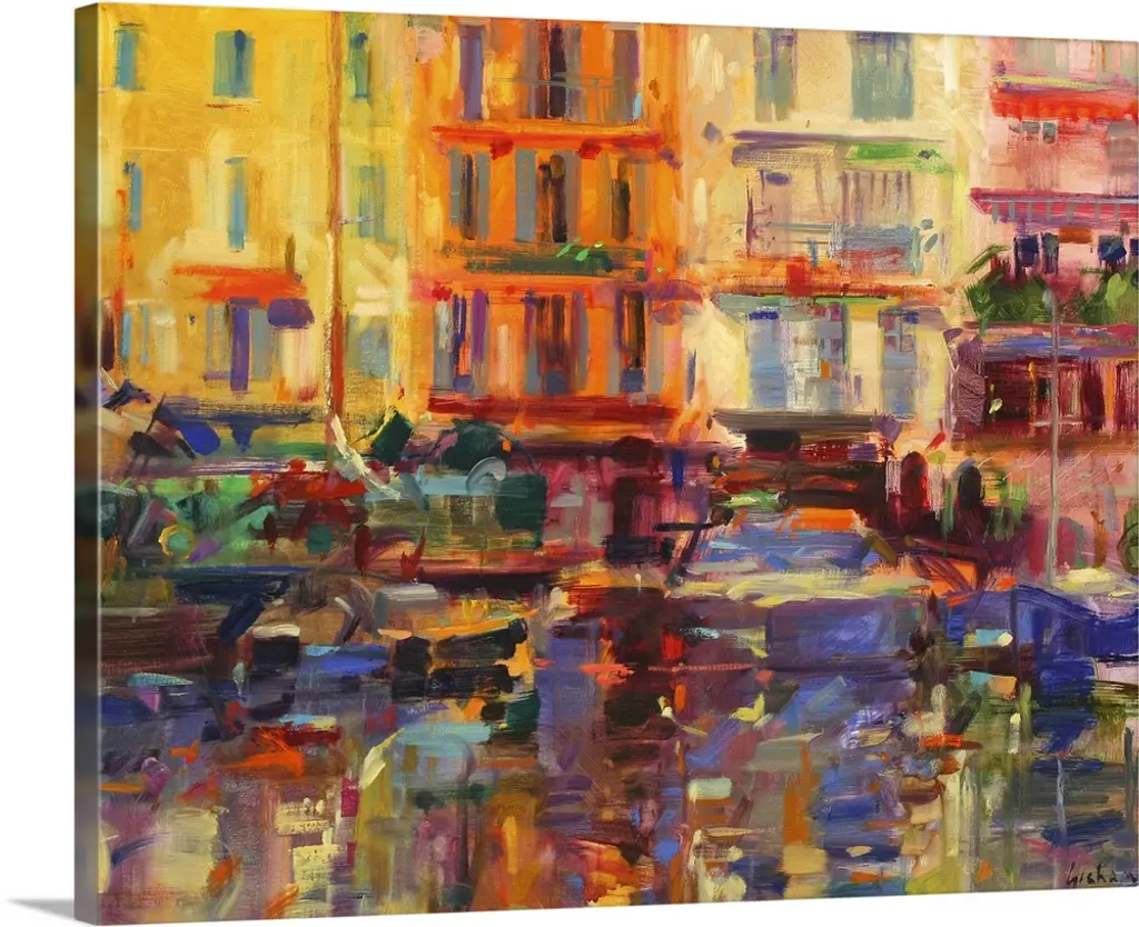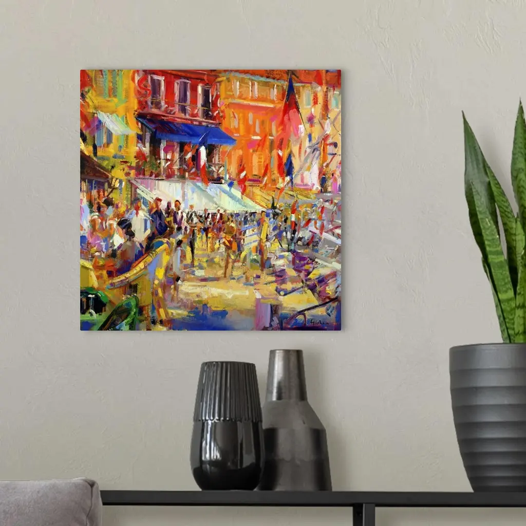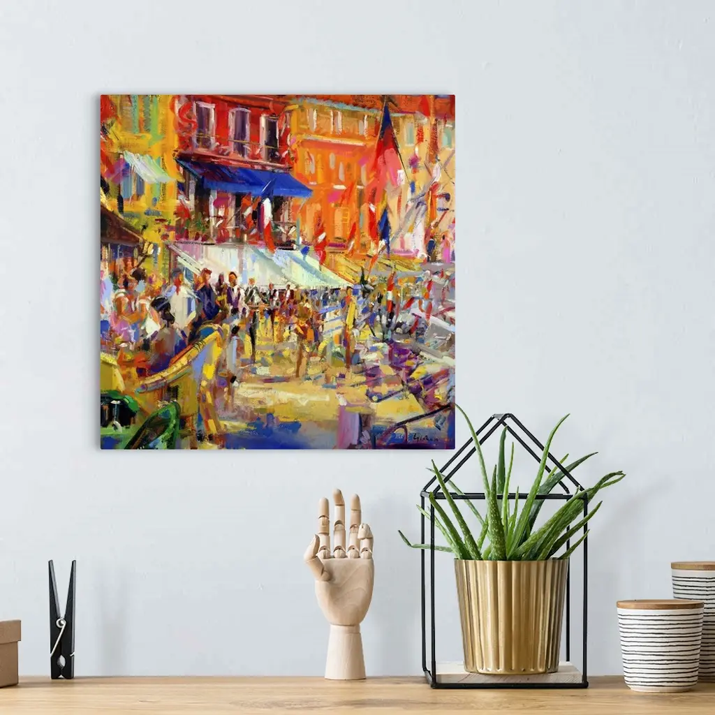 Colorful bright oil painting of street carnival with flags blowing in the wind.