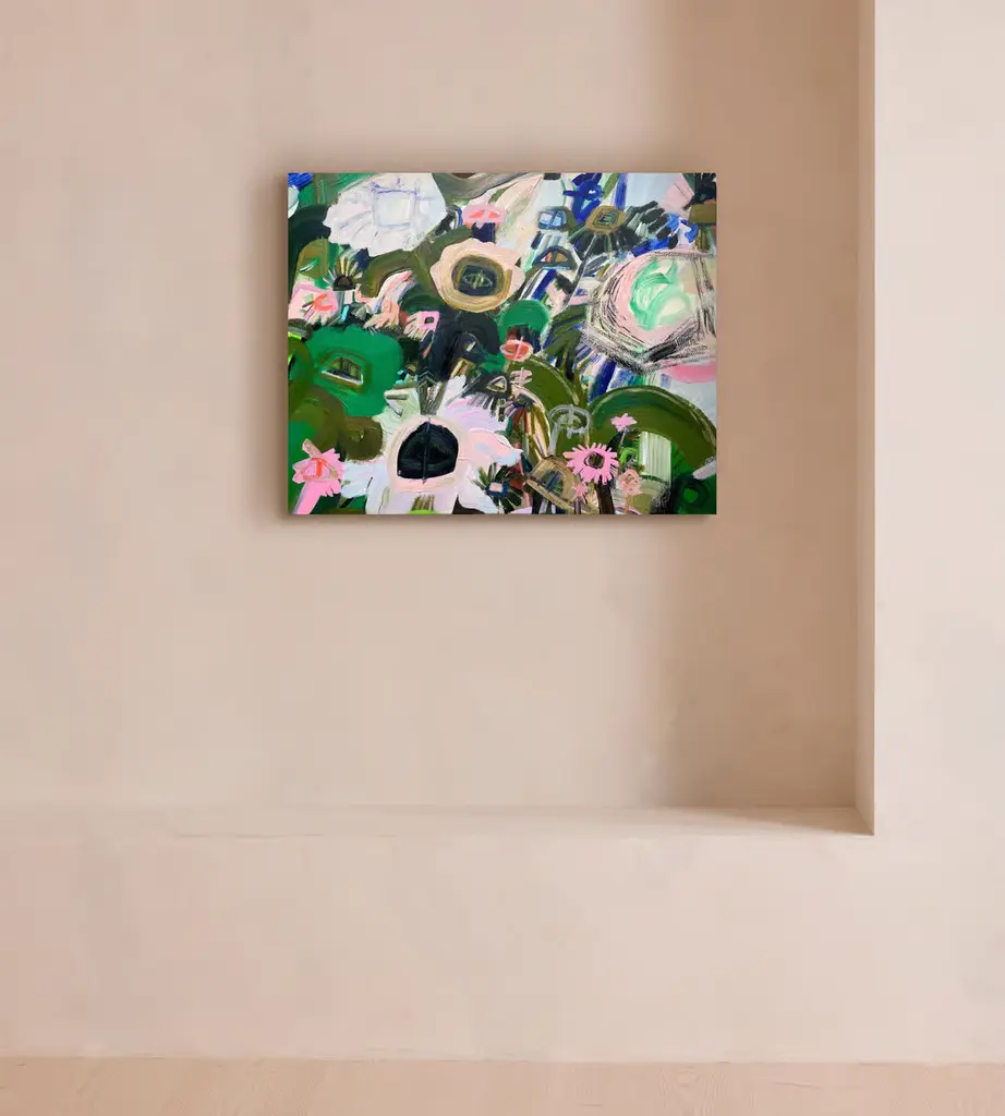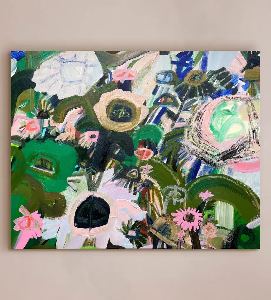 Acrylic paint and oil pastel blend on canvas to create an original botanical painting. Katy Smail is a Scotland-based artist. Working across a range of scales, including canvas, unstretched cloth and wall-based surfaces, her artwork depicts the natural world and its overlooked qualities, reconnecting the viewer with nature's quiet yet profound power.