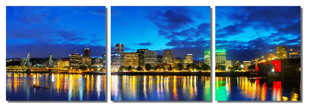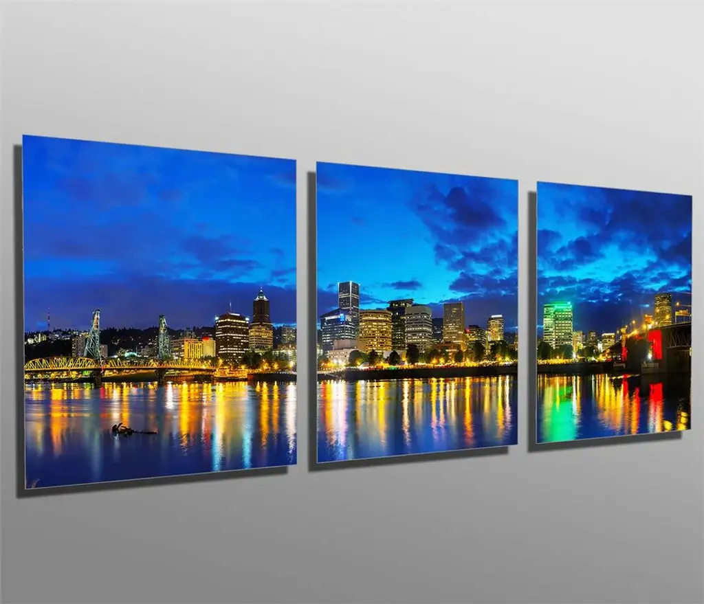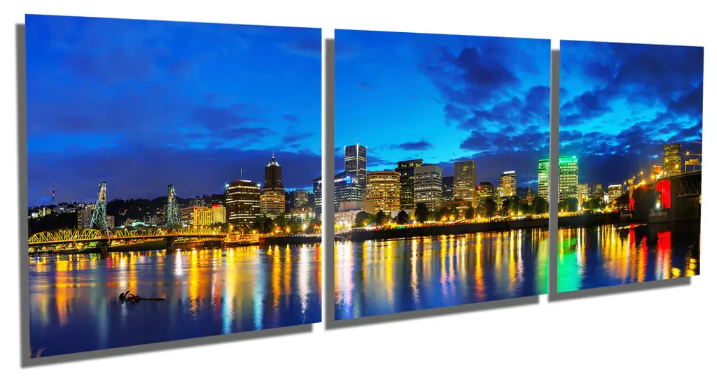 45"œ x 15"œ total size. Ready To Hang! (3 pieces - 15"œ x 15"œ each). 3 Panel Split (Triptych) Metal Print of Portland, Oregon Cityscape at dawn. Modern metal wall art for home or office wall decor & interior design. Printed on Luxurious, HD aluminum glossy metal panels. Multi panel art.. HD aluminum panels. Metal print wall art. Includes Shadow Wall Mount on the back.• Aluminum Metal Wall Art• Made in USA• Ready to hang - No assembly required• Shadow mount hardware on the back• 0.045"œ thick HD Aluminum Panels• Scratch resistant, glossy finish• Superb color clarity, luxurious prints• Epson printing process• For indoor or moisture rich environment use• Easy to clean. Gently wipe with microfiber cloth.