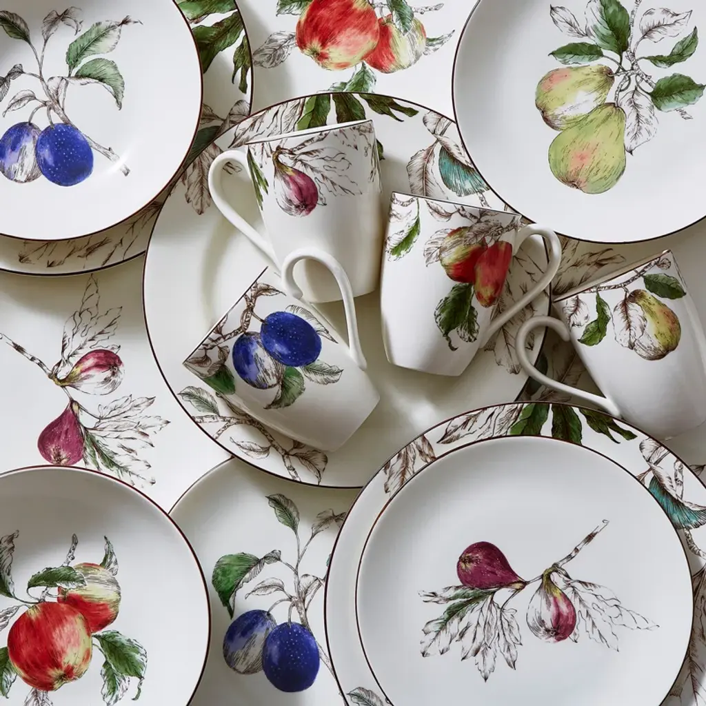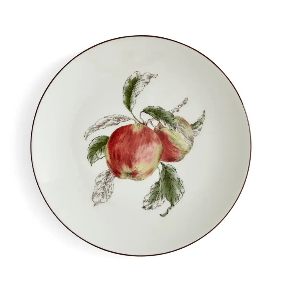 Nature's bounty reinterprets classic and treasured botanical illustrations in a modern way and pays homage to the beauty of the orchard. This 4 piece's place setting features exquisite sepia ink drawings mixed with lush watercolor paintings of apples. Featuring one of each: Dinner plate, salad plate, all-purpose bowl, and mug, this set captures the magic of the orchard in full bloom. Crafted in the finest pure white porcelain, this tableware is dishwasher, microwave, oven, and freezer safe.