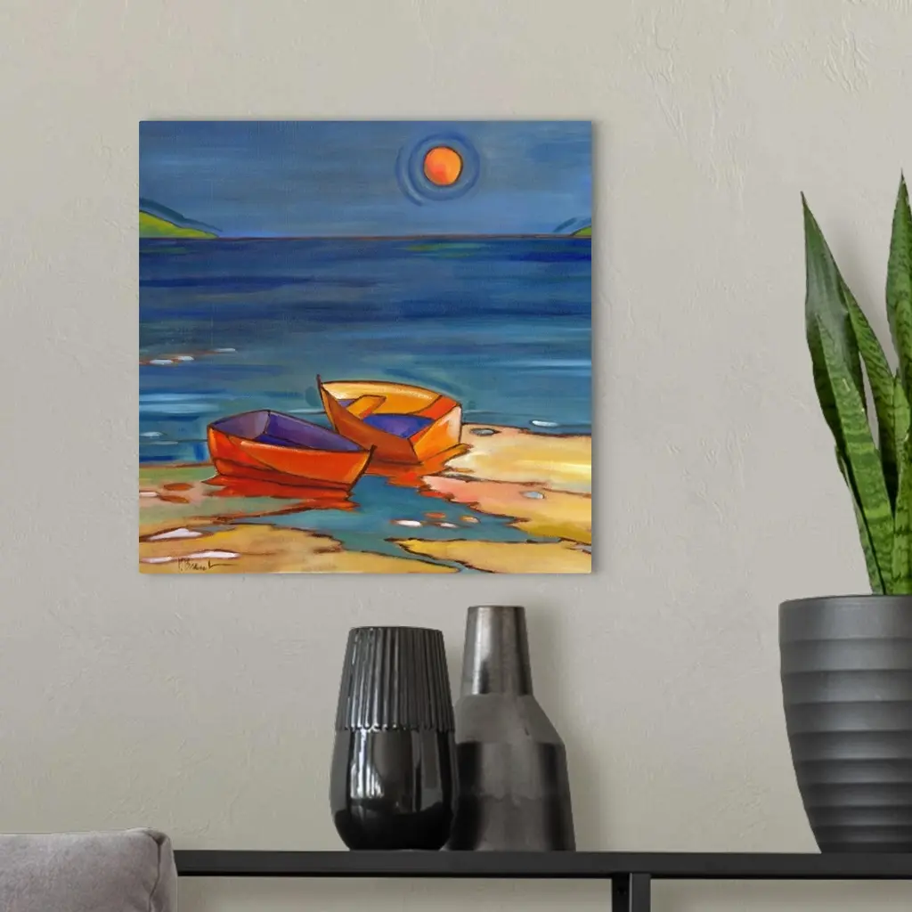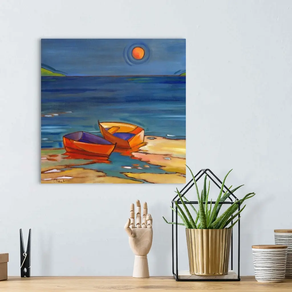 Stylized painting of a beach with two small boats on the shore under the sun.