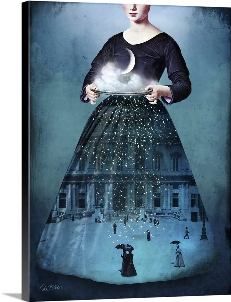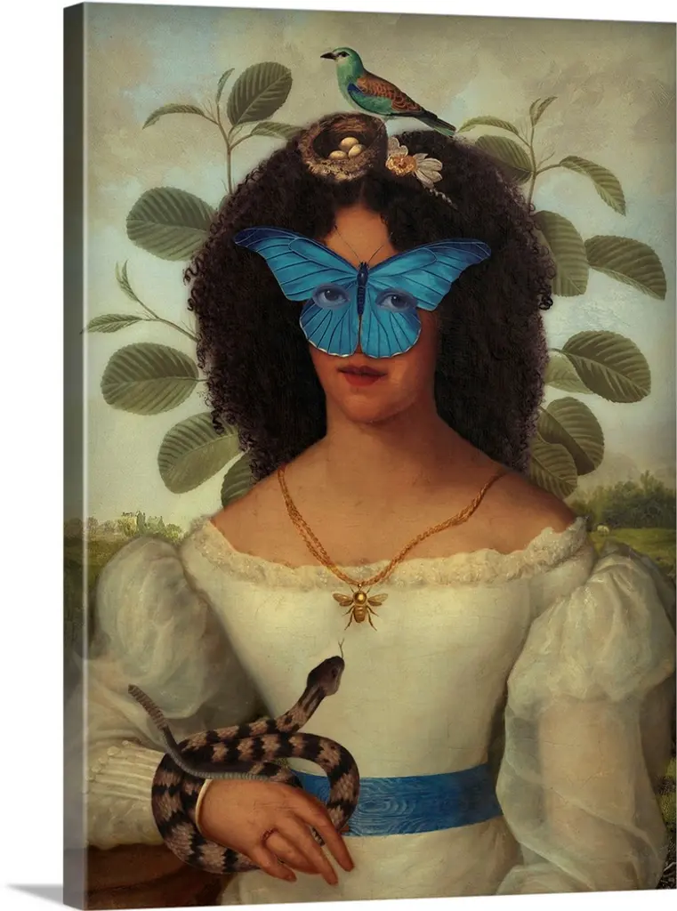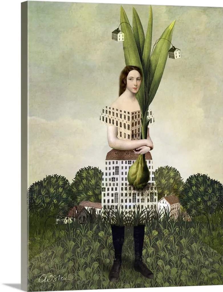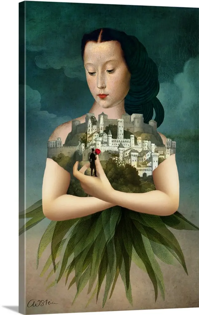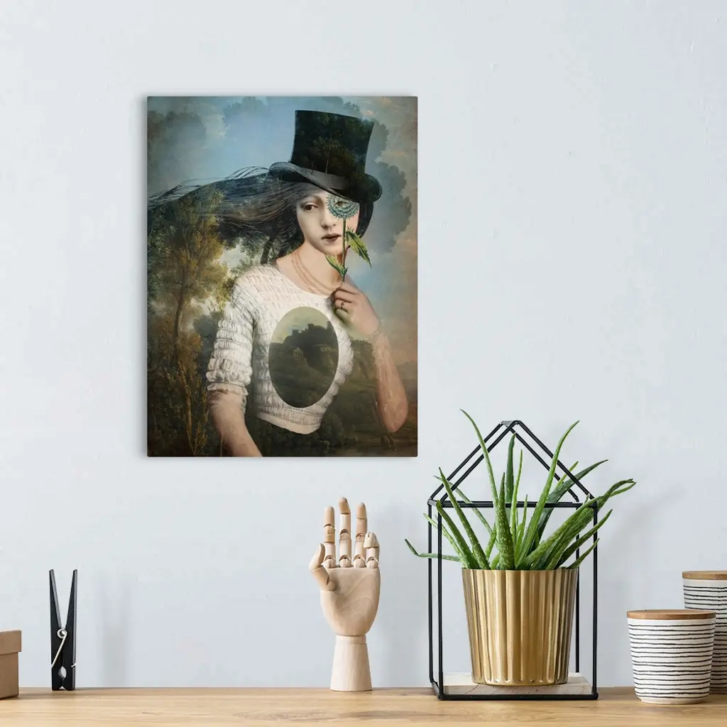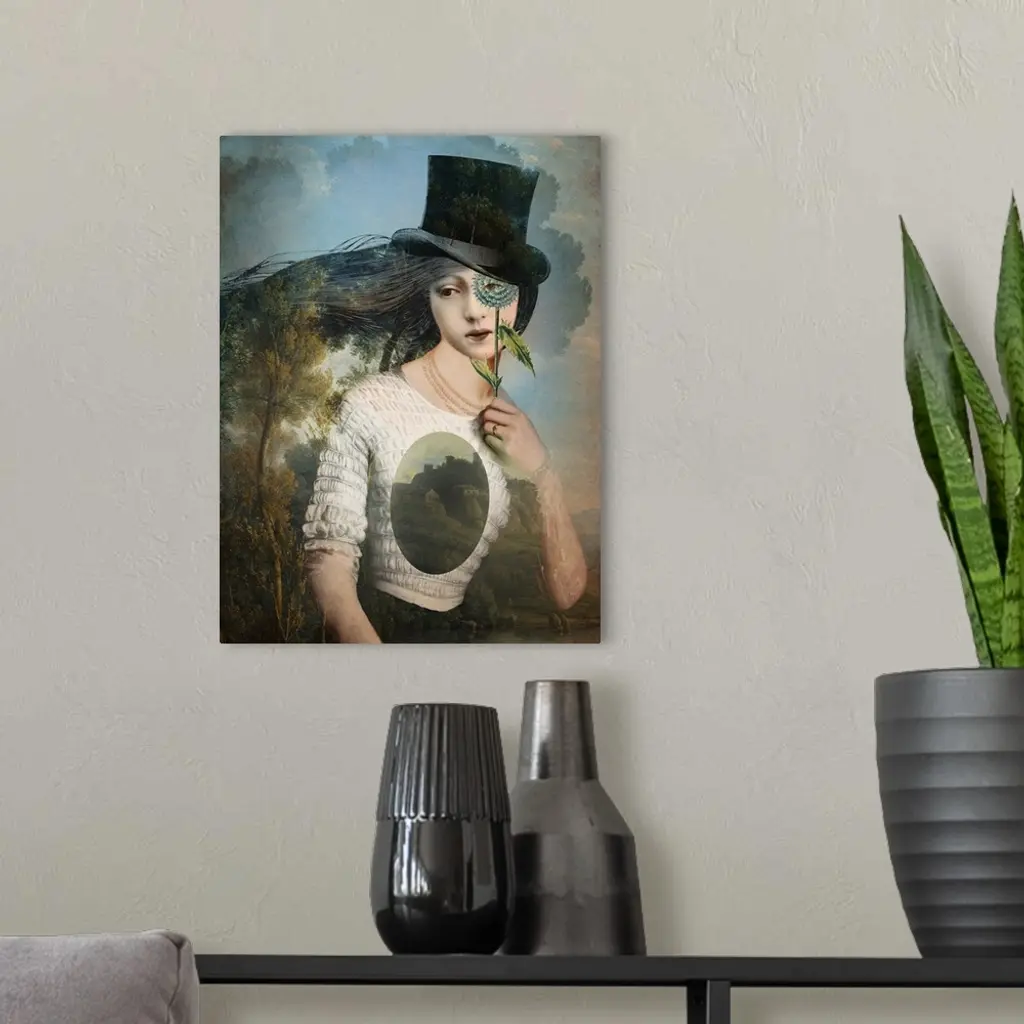 A portrait of a lady with a top hat is looking through a flower at one eye. You can see the country landscape through her torso.