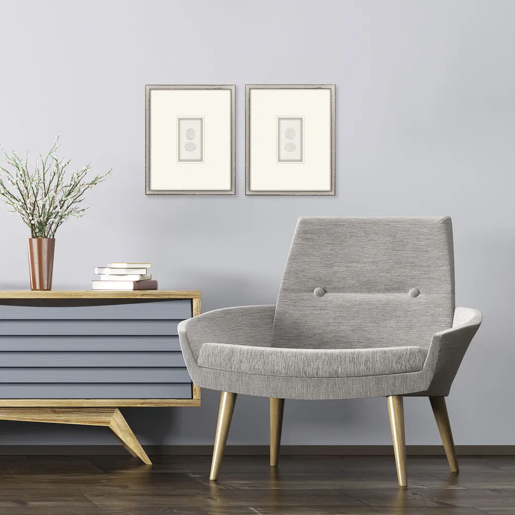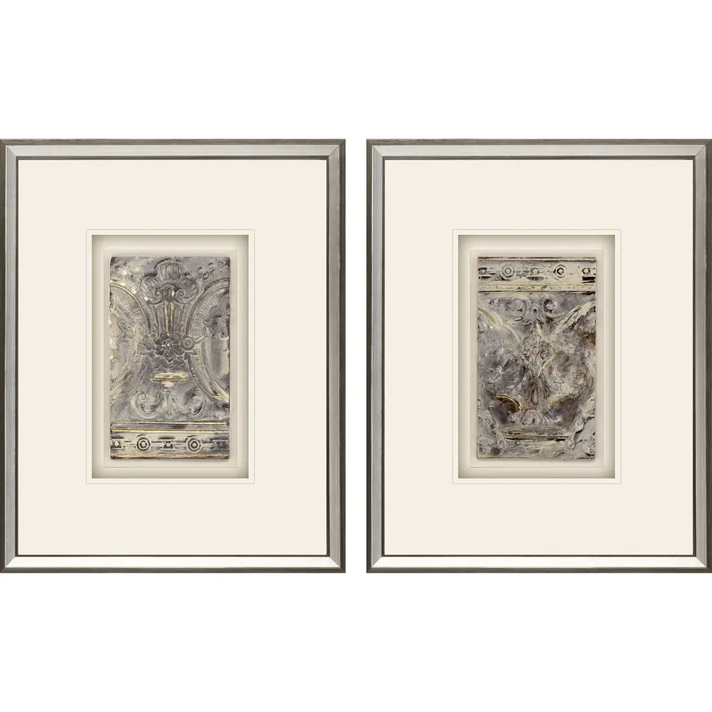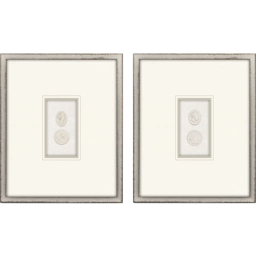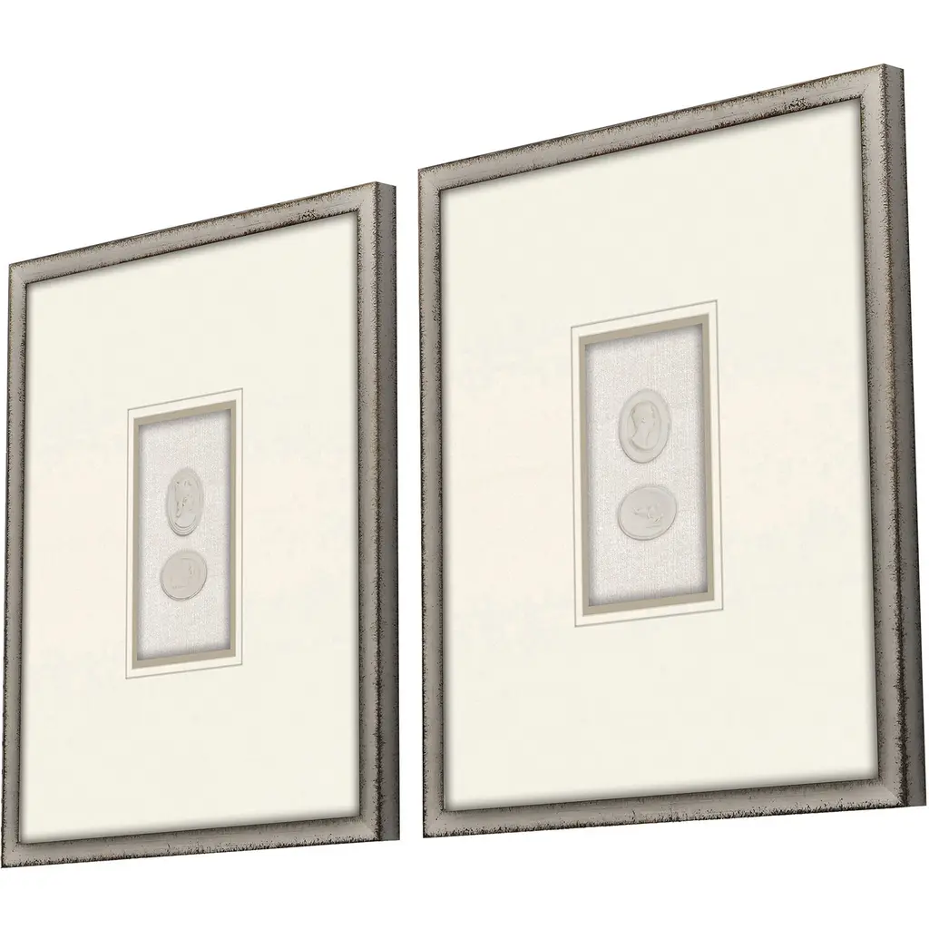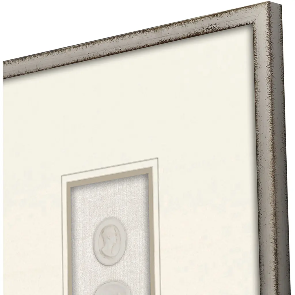 Traditional portrait intaglios are mounted on a premium mat with white matting. Framed in an antique silver wood with rubbed edges.