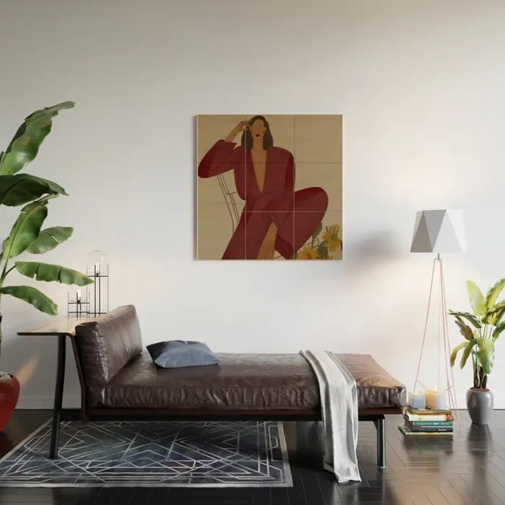 Portrait Of A Fragile Woman In A Red Suit With Sunflowers Wood Wall Art