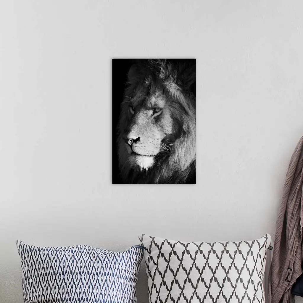 Close-up of a lion (panthera leo), head shot portrait of a male animal looking out into the savanna at sunrise, Serengeti, Tanzania.
