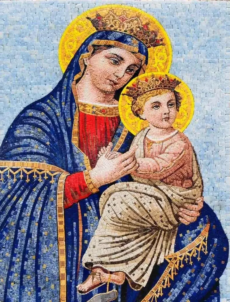 Introducing the exquisite "Portrait Of Virgin Mary In Royal Blue and Gold," a stunning embodiment of artistry and devotion that will elevate any space in your home. This magnificent mosaic portrait of the Virgin Mary features intricate details and vibrant colors that breathe life into the scene, creating a breathtaking visual experience for all who behold it. Crafted by skilled artisans, this handmade mosaic portrait is meticulously designed with premium natural stone marble and luminous gold glass, ensuring that each piece is unique. The Virgin Mary is elegantly attired in royal blue, symbolizing purity and love, while tenderly cradling the infant Jesus. The meticulous layering of materials over a striking golden background adds depth and warmth, capturing the essence of spiritual grace. Enriched with radiant brown quartz that exudes a warm, earthy shimmer and dark red quartz with its jewel-like, crystalline brilliance, this artwork showcases luxury stone at its finest. The mosaic’s dark blue quartz offers a deep cerulean radiance, enhancing the royal blue attire with a captivating, cool-to-the-touch elegance, while the light red quartz provides a subtle, prismatic glow that adds a delicate vibrancy to the composition. This artwork is not just a decorative piece; it is a celebration of faith and a timeless reminder of divine love. Perfect for display in a living room, study, or place of worship, the "Portrait Of Virgin Mary In Royal Blue and Gold" serves as a focal point, inspiring contemplation and reverence. Ideal for anyone seeking to enhance their spiritual space or gift to loved ones, this handcrafted mosaic portrait of Virgin Mary is more than just a beautiful decoration; it is a heartfelt expression of devotion that resonates deeply with the viewer. Bring home this elegant piece of exotic materials and let its beauty and significance fill your environment with warmth and serenity.