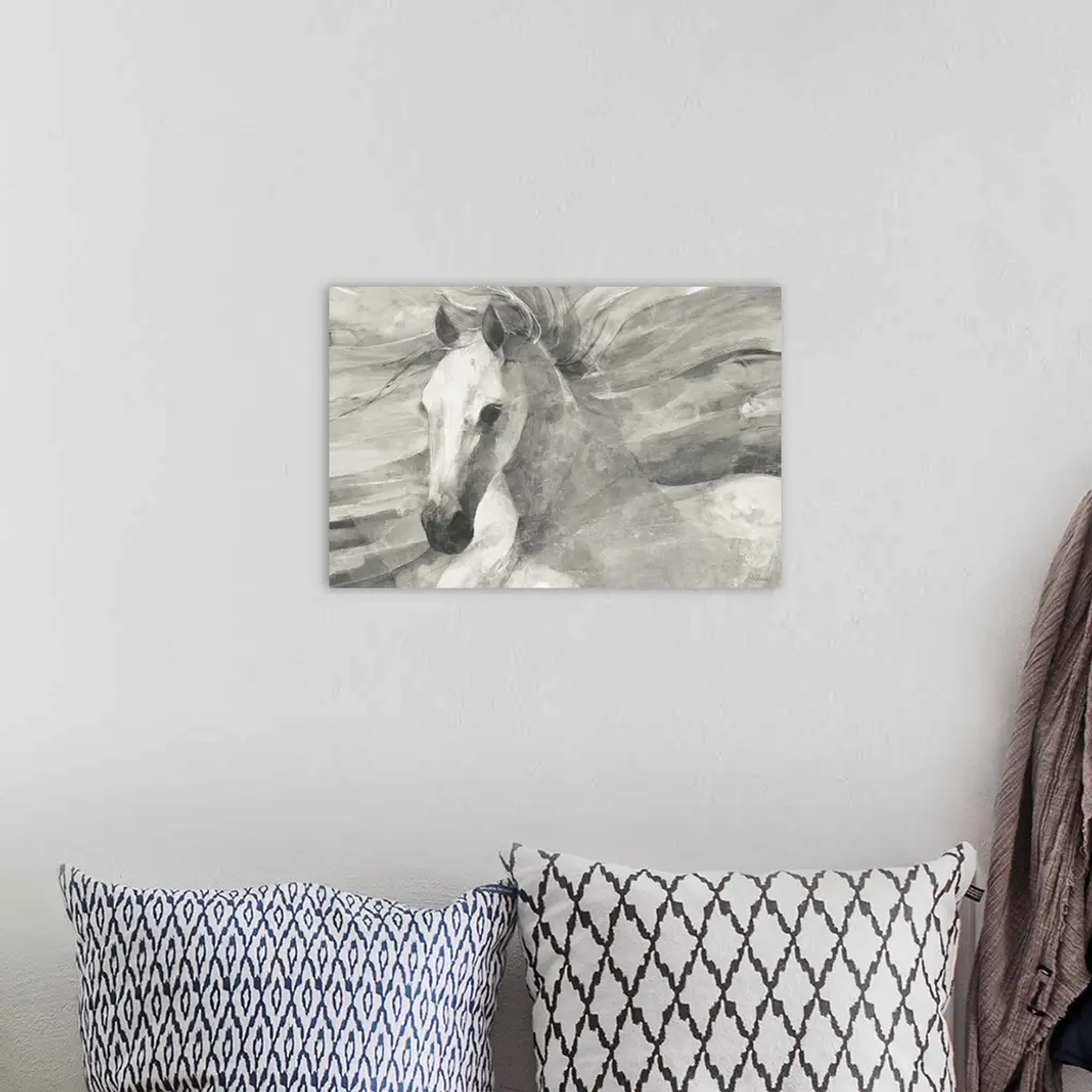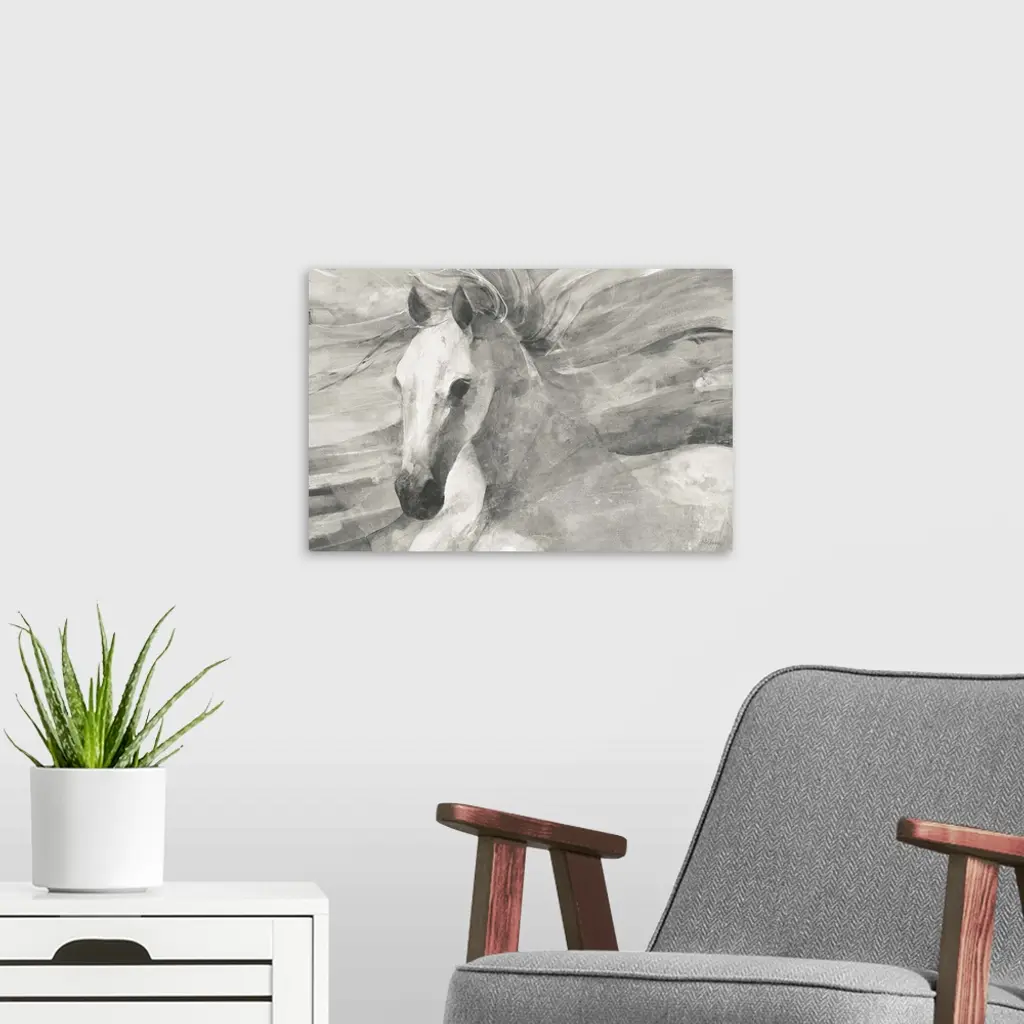 Black and white painting of a horse with flowing horizontal lines in the background creating movement.