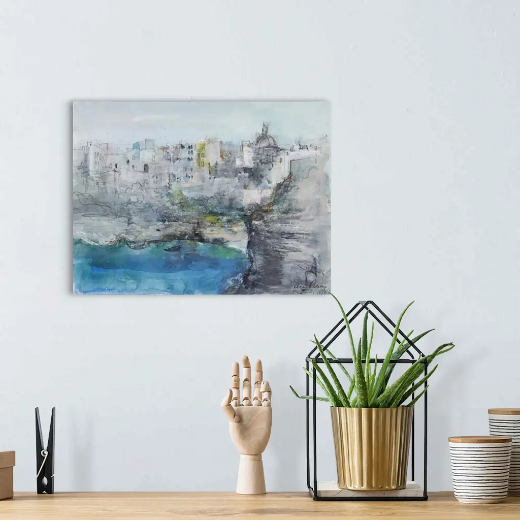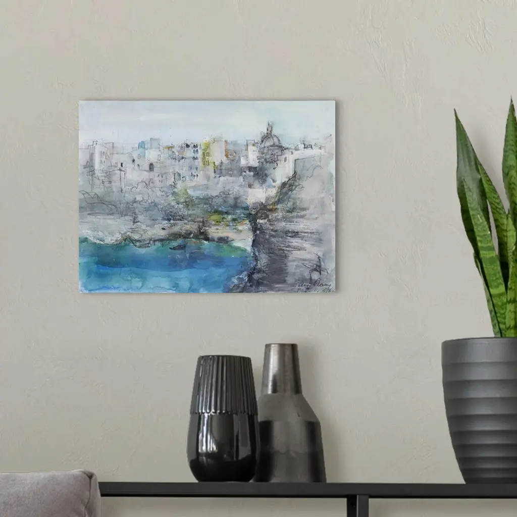 A beautiful abstract landscape painting of the Italian coastal town of Positano in muted blues and greys, accented with charcoal scribbles. A very light and airy art piece