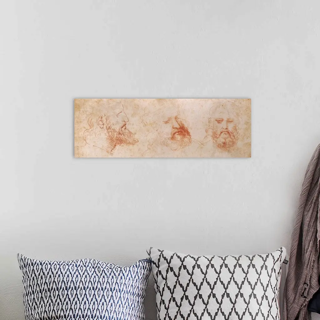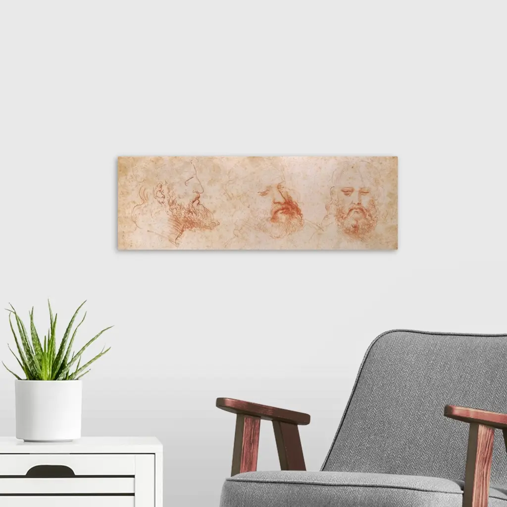 Leonardo da Vinci, Profile, three-quarter and frontal study of a male head, possibly a portrait of Cesare Borgia, 1502, 16th Century, sanguine on yellowed white paper, Italy, Piemonte, Turin, Royal Library (18769) Everett Collection\Mondadori Portfolio