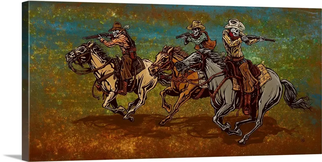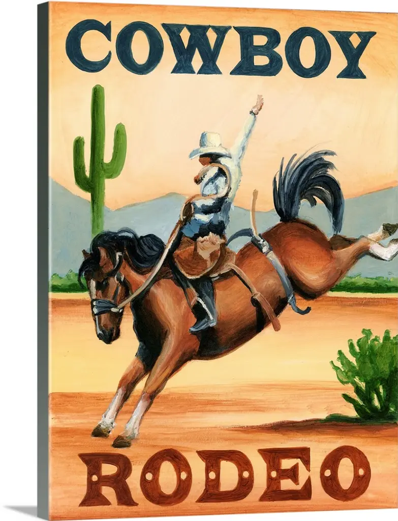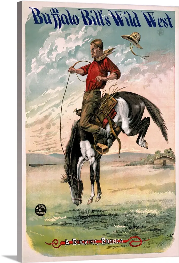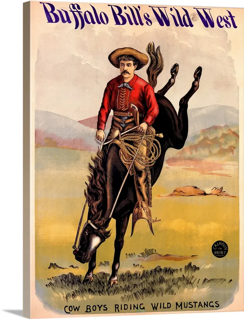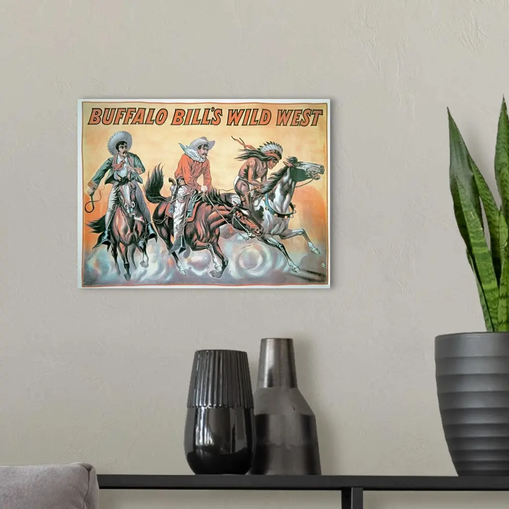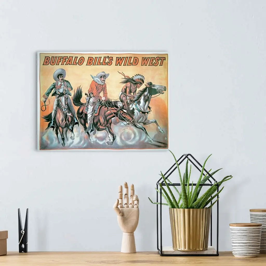 This vintage poster is for Buffalo Bill's Wild West Show. Three men, two cowboys and an Indian, are drawn riding their wild horses.