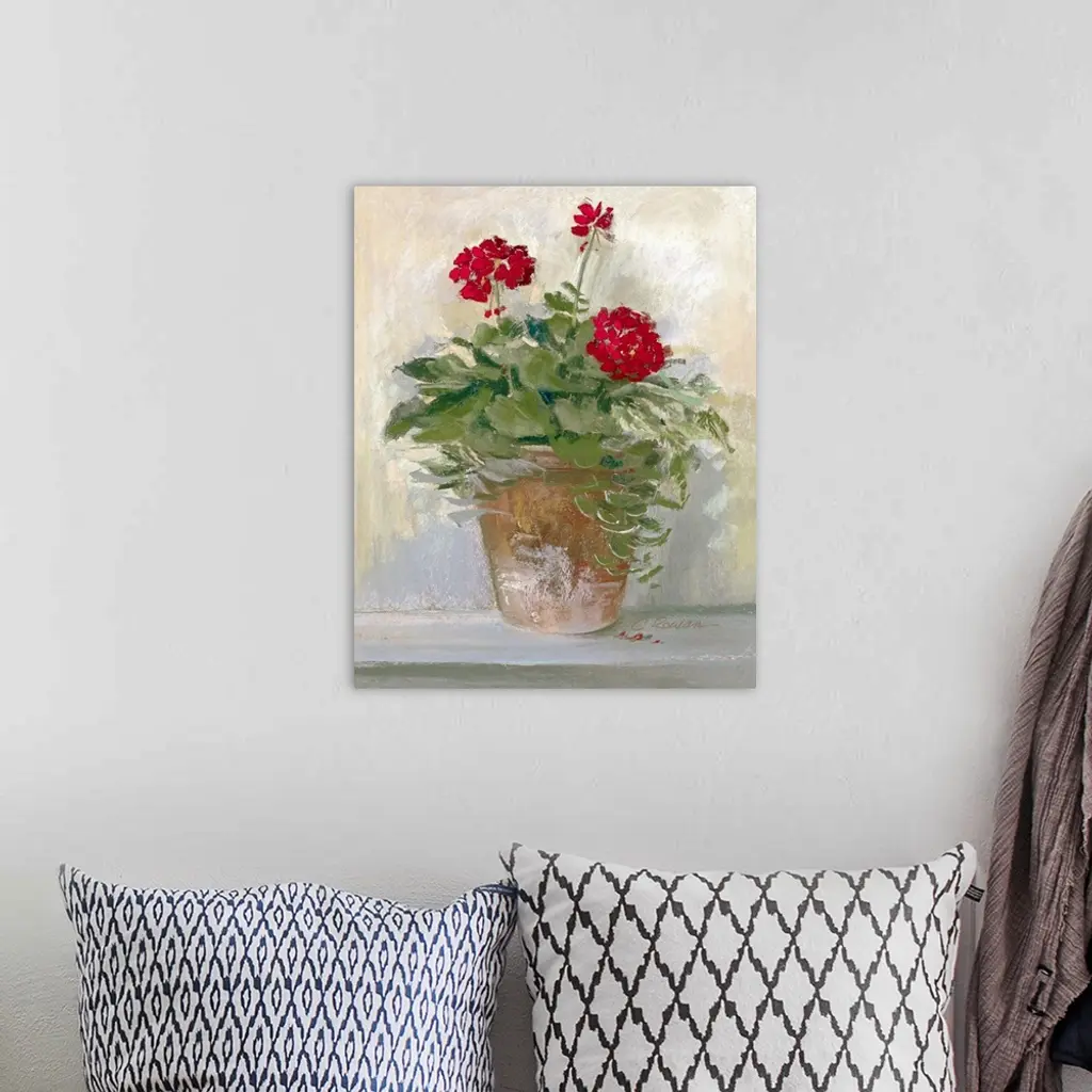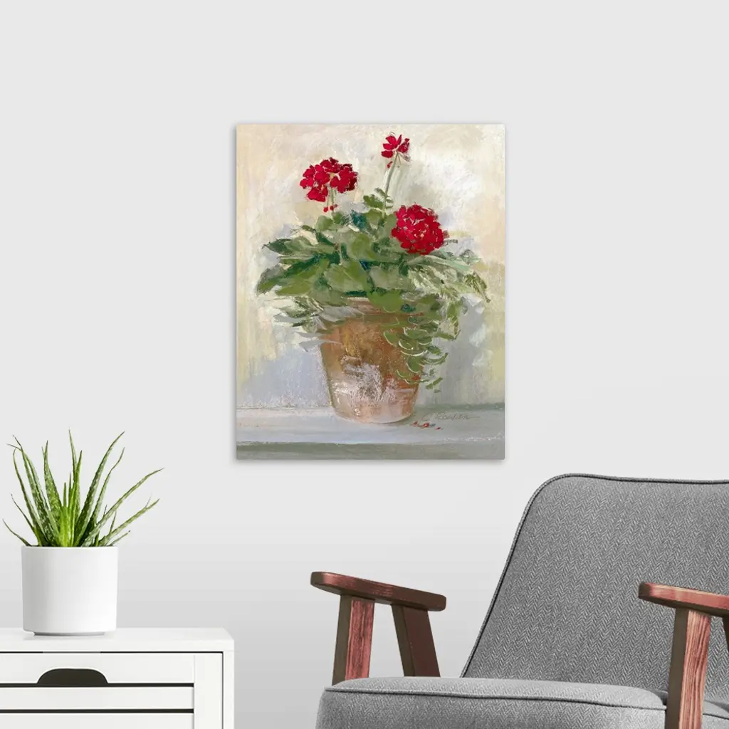 Large painting on canvas of flowers planted in a pot sitting on the ground near a wall.