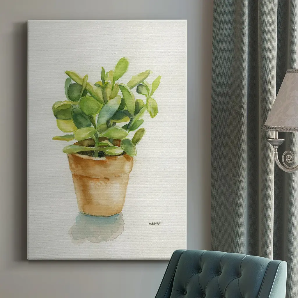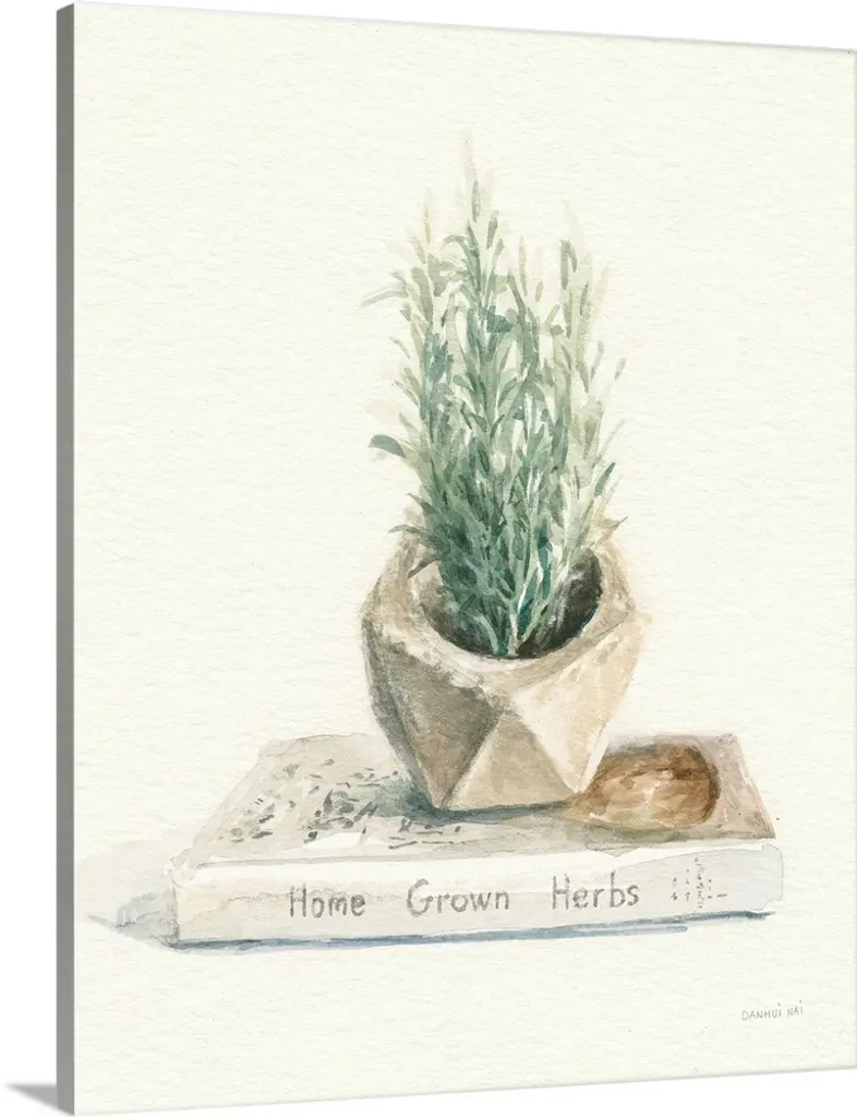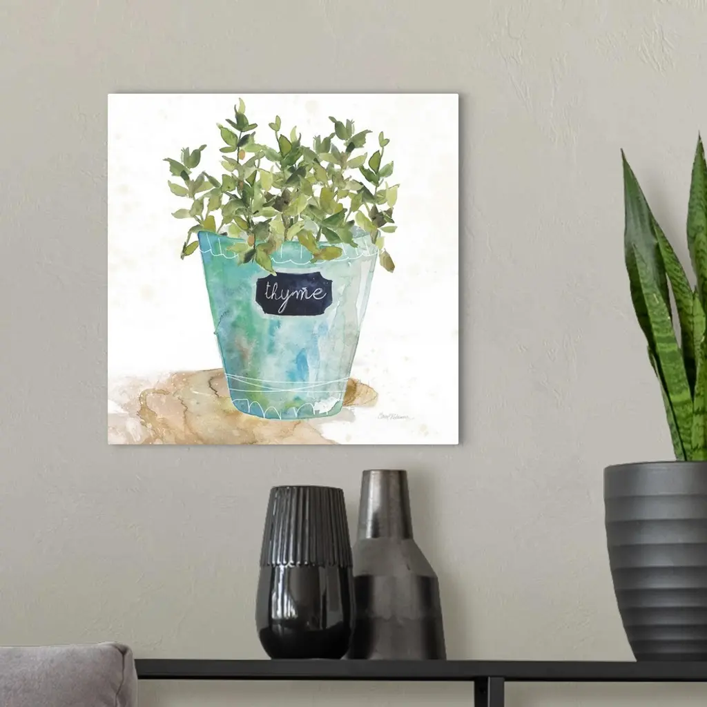 Square watercolor painting of a potted thyme plant.