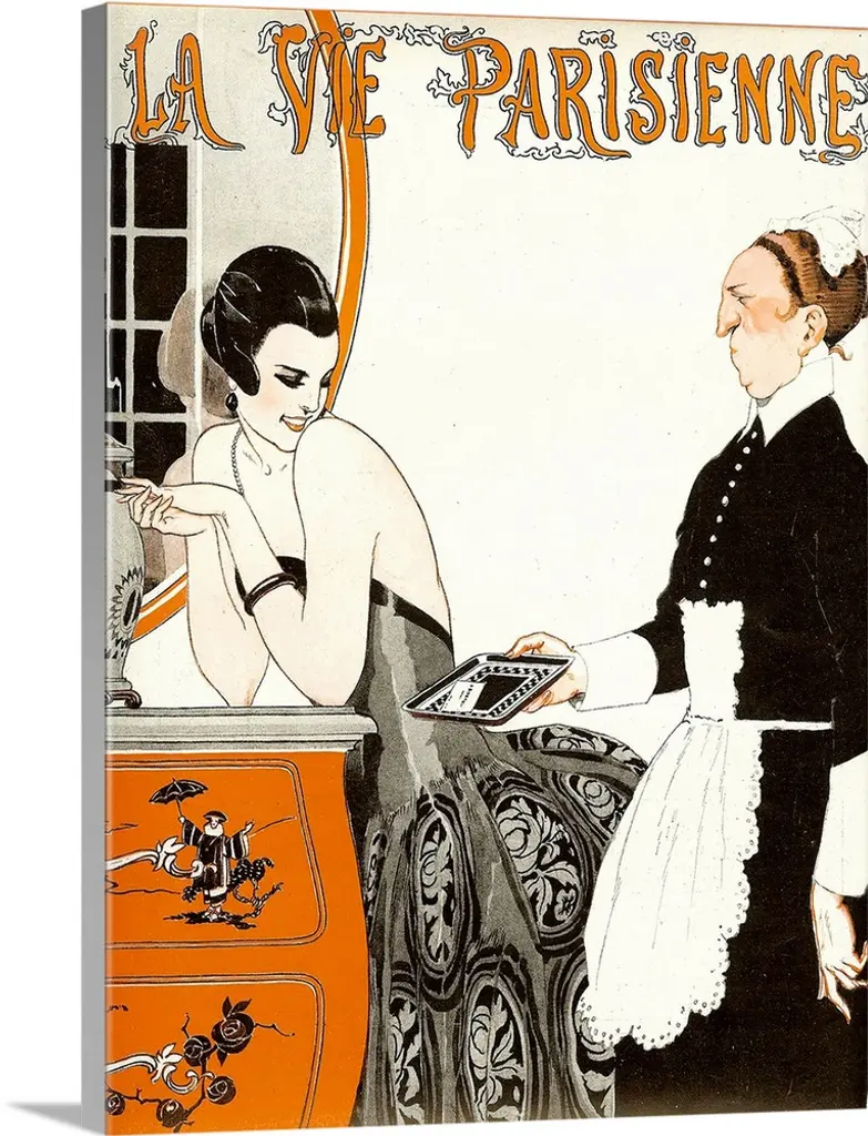 A large vertical vintage poster with two men in tuxedos staring at a tall woman in the center wearing a yellow ball gown and several strings of pearls.