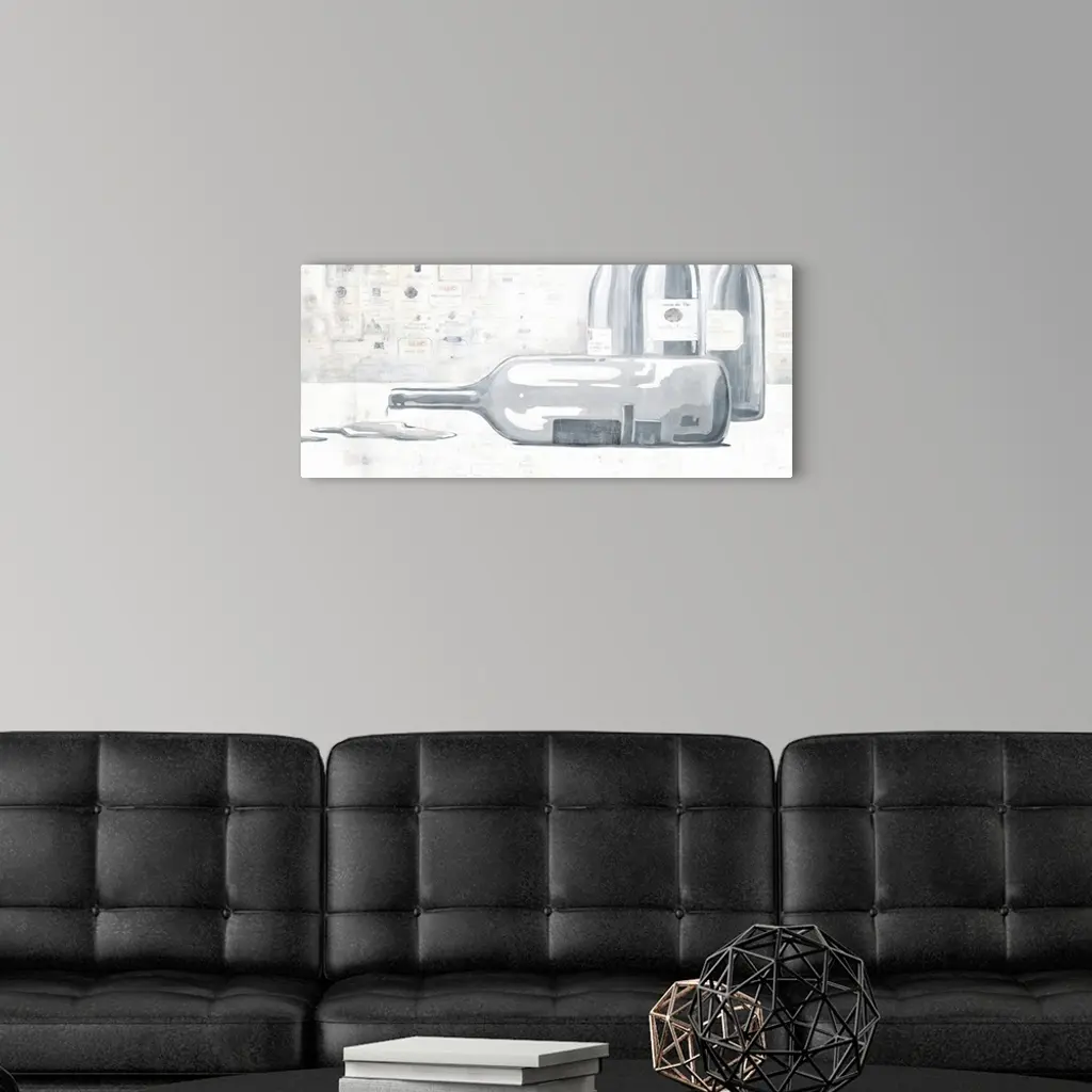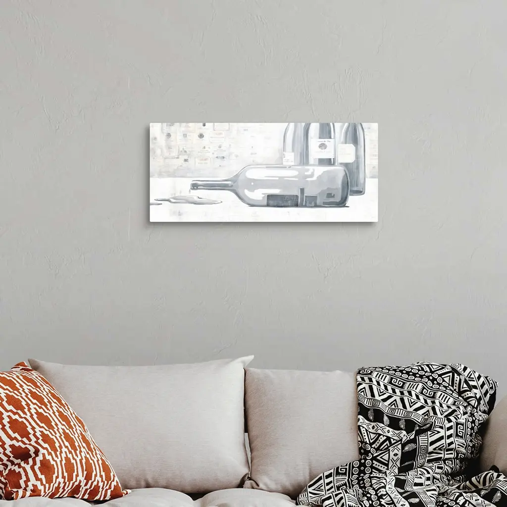 Contemporary painting in gray tones of wine bottles with one on its side with wine dripping out onto the ground and faint wine labels making up the background.