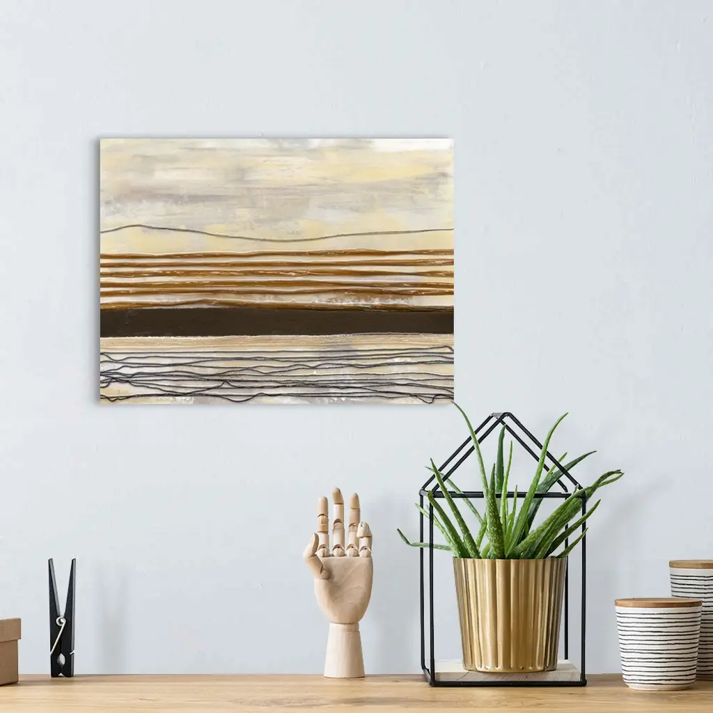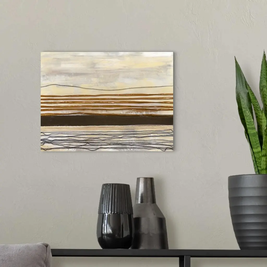 Contemporary abstract painting using horizontal stripes and earth tones with a rustic feel.