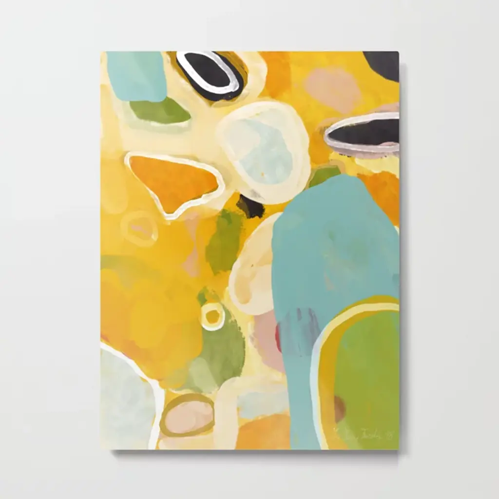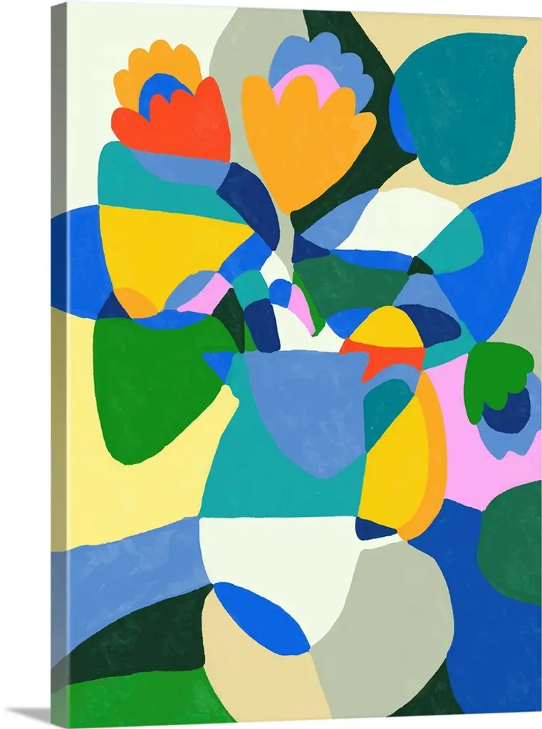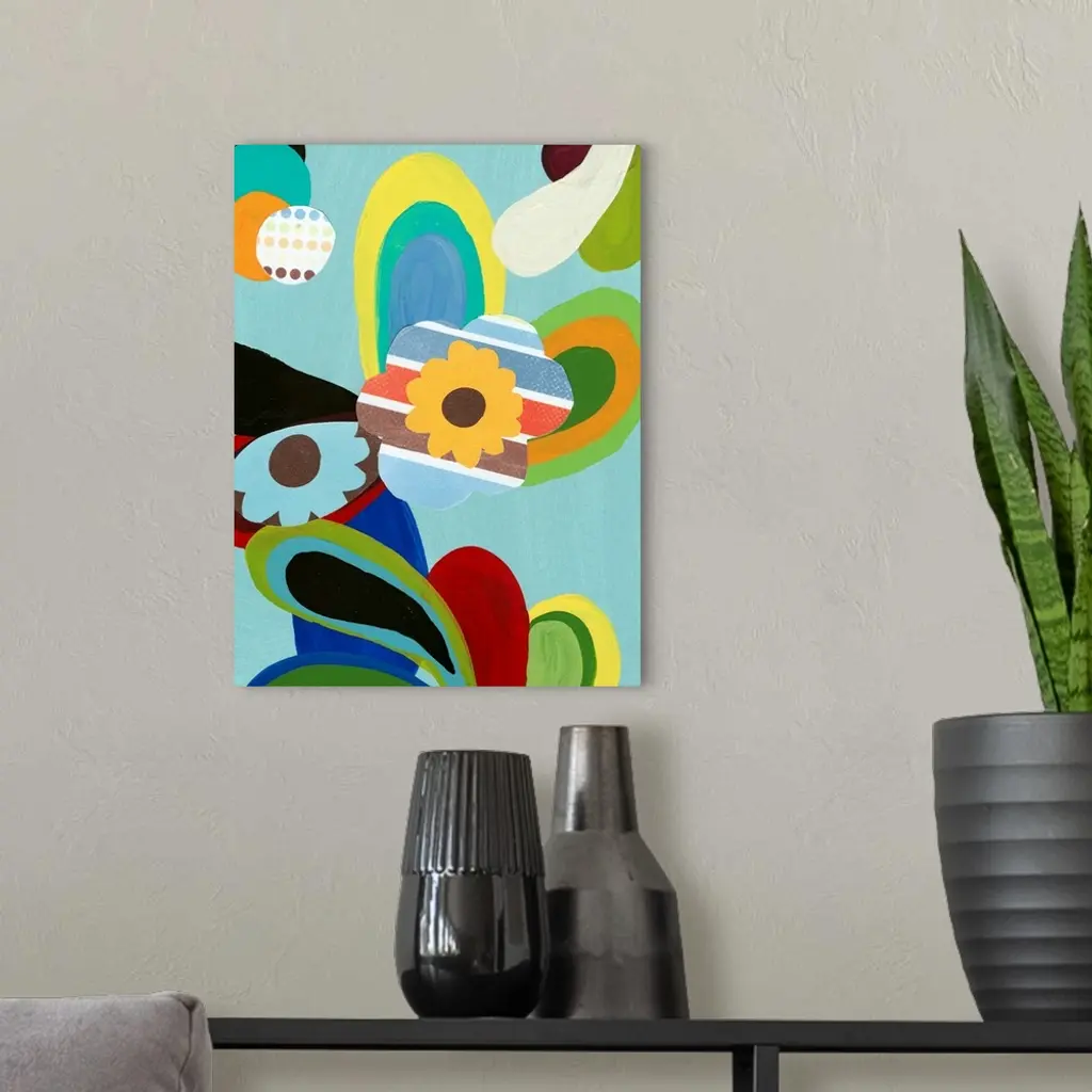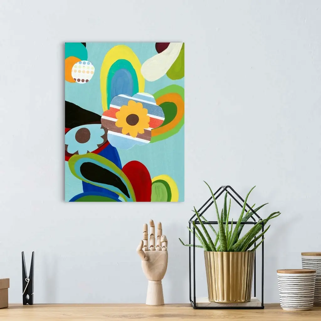Big, vertical retro painting of a small flower in the middle with striped, multi-colored petals, surrounded by overlapping floral shapes, as if other flowers had been deconstructed. Painted on a solid background.