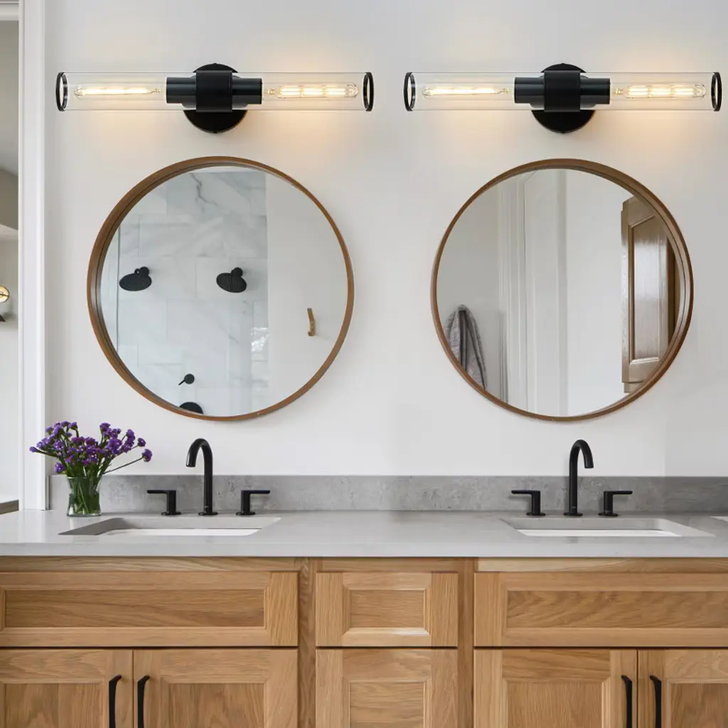 The simple and advanced appearance of the bathroom light fixtures is perfectly matched with any decoration style. The durable black-finished metal frame and thickened transparent glass shadesc create elegant light diffusion, perfect above bathroom vanitbies, in cpowder rooms, or along hallways. Fully dimmable (compatible with dimmable bulbs and switches) with E26 bases (Type T bulbs recommended, 60W max each, 110-120V). Includes all mounting hardware for easy vertical or horizontal installation. Backed by 1-year warranty. Bulbs and dimmer switch not included.