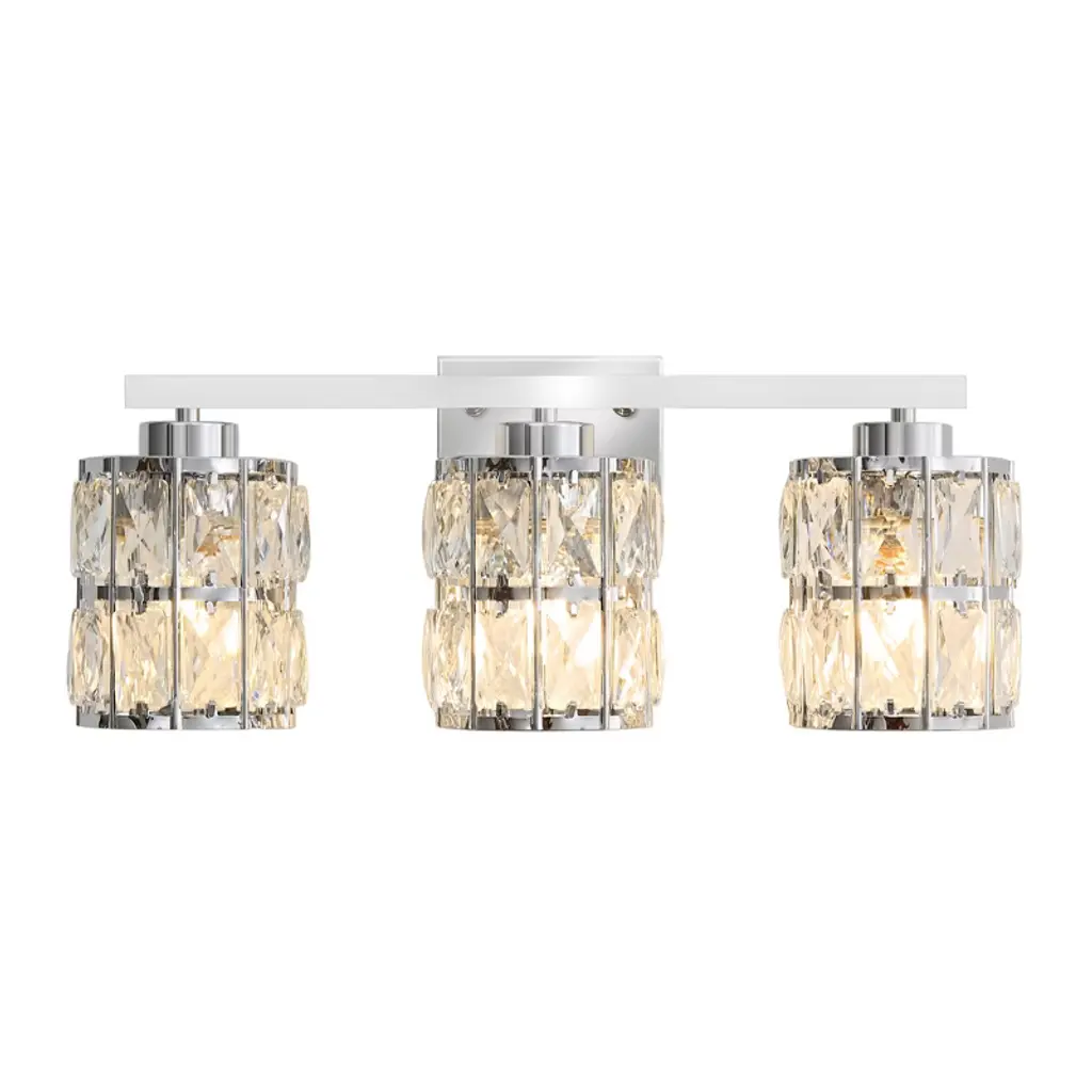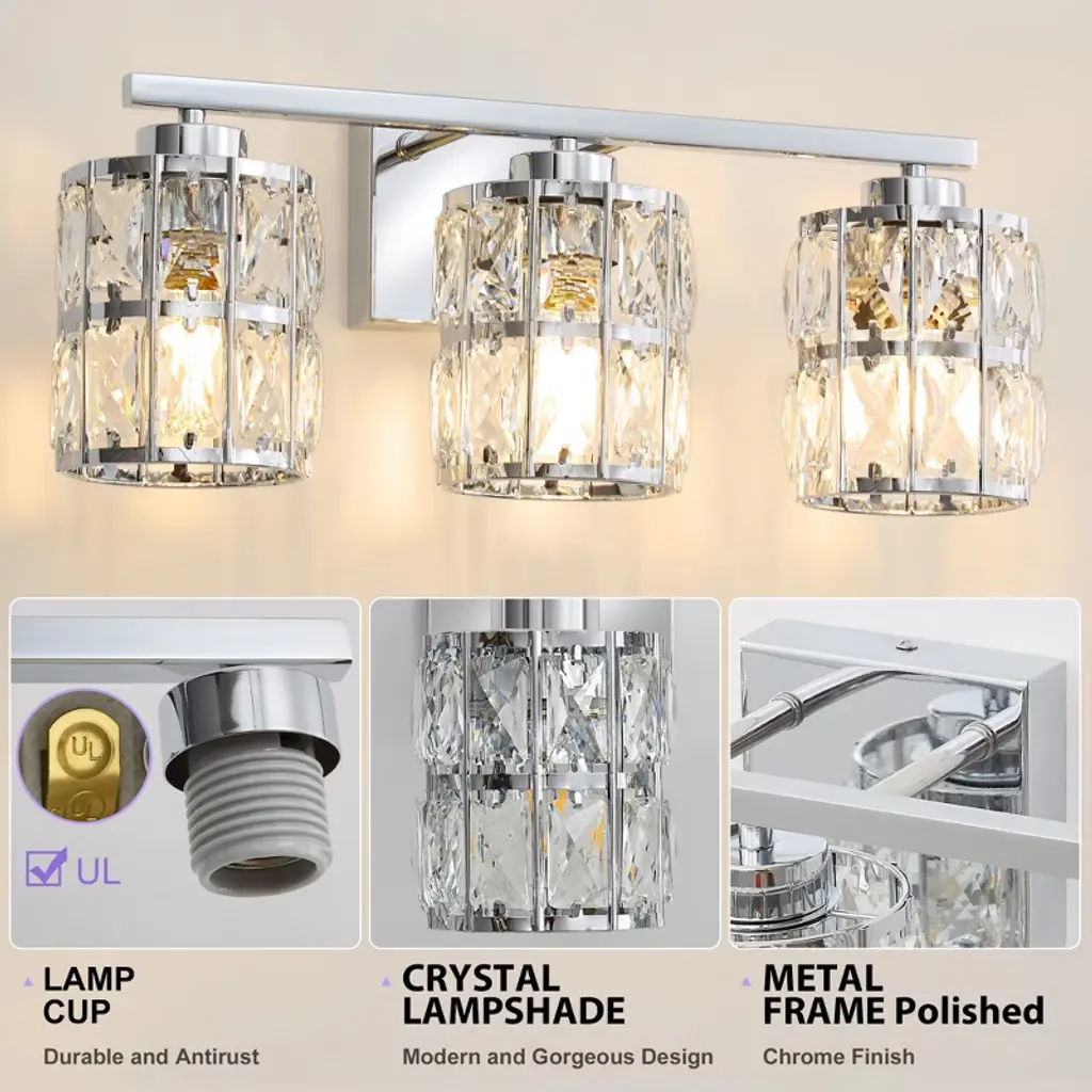 Powlig 3-light Chrome Dimmable Vanity Light – 18.9" Modern Bathroom Fixture With Cylinder Bilayer Crystal Shade