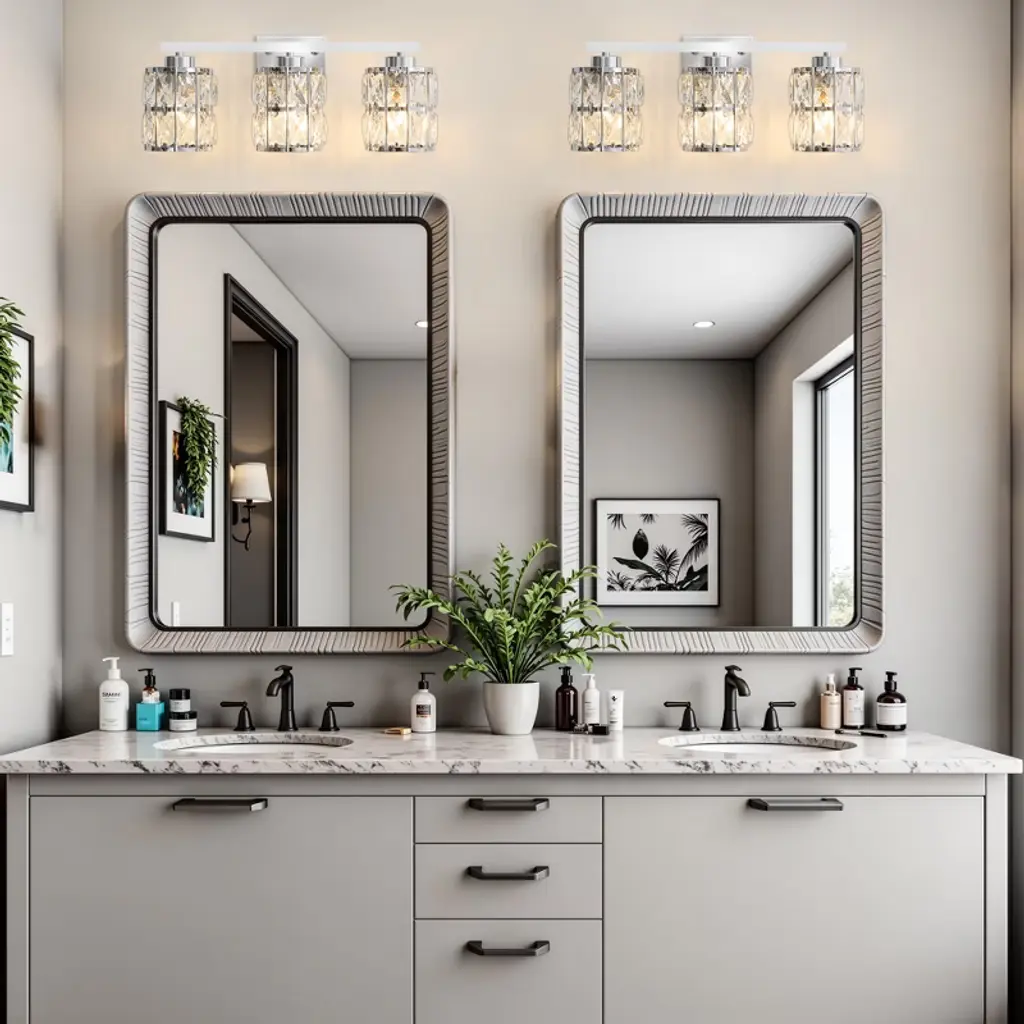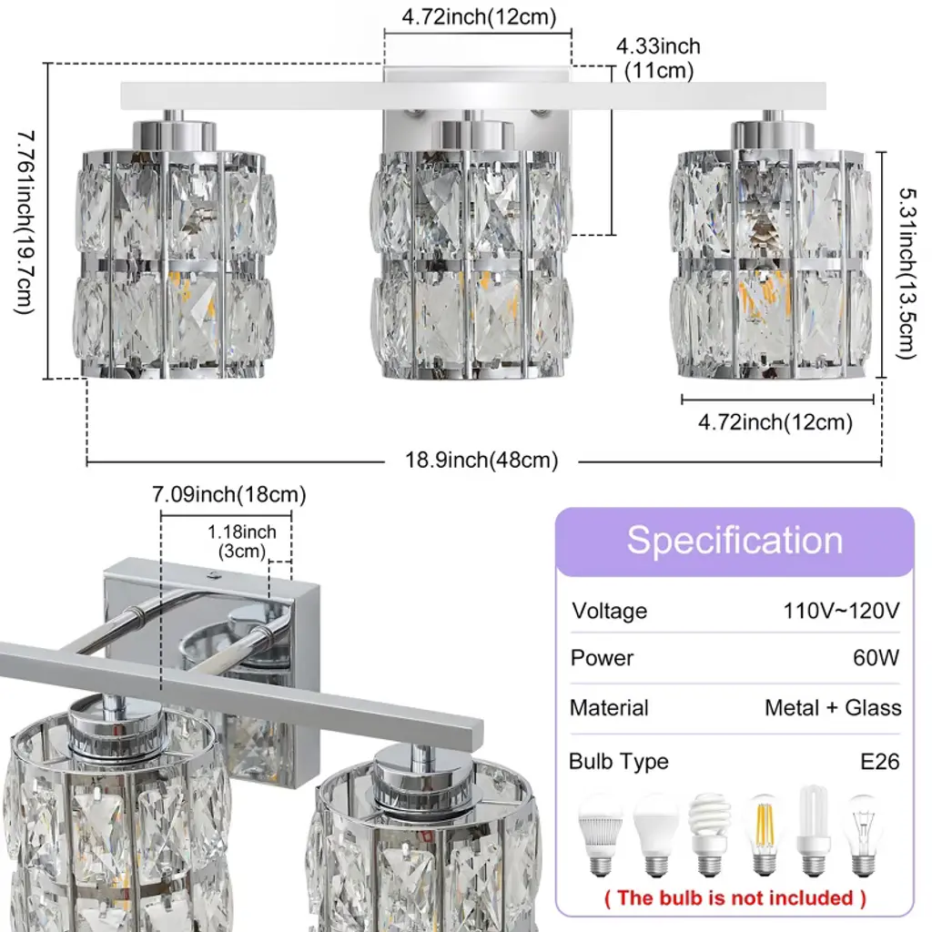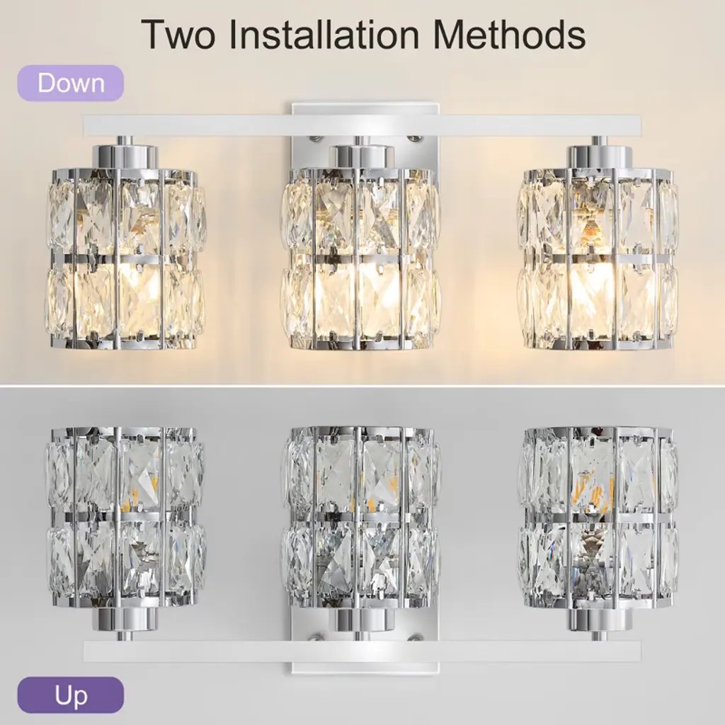 This modern bathroom light features a high-quality metal frame and stunning double-layer K9 crystal shades that create brilliant, sparkling refraction for a luxurious glow. The durable, rust-resistant metal construction ensures long-lasting performance in humid environments. Compatible with E26 bulbs (60W max, 110-120V), this UL-certified fixture offers versatile 360° illumination - install it facing up or down to suit your space. Fully dimmable when paired with compatible bulbs and switches (not included), it adds gorgeous, adjustable lighting to vanities, mirrors, or dressing areas. The sleek metal finish and exquisite crystal design blend effortlessly with contemporary, traditional, or transitional decor styles.