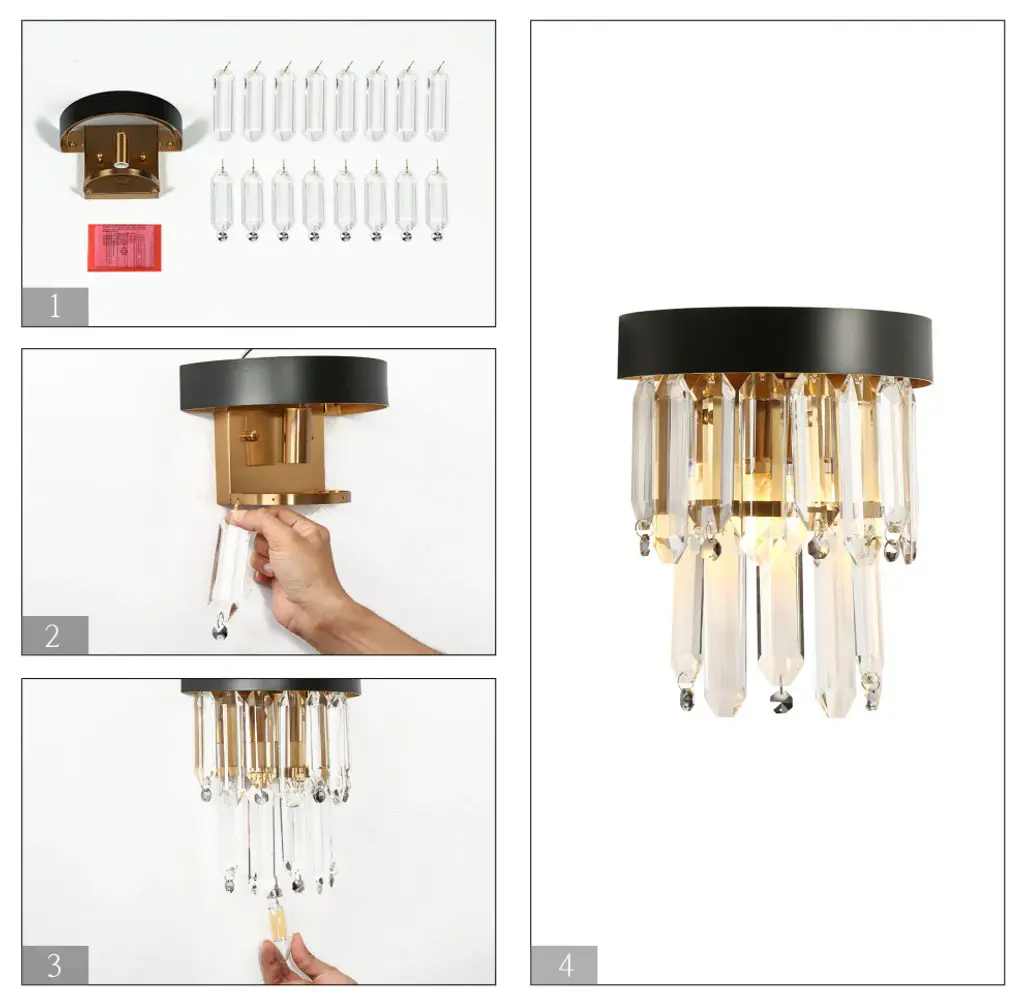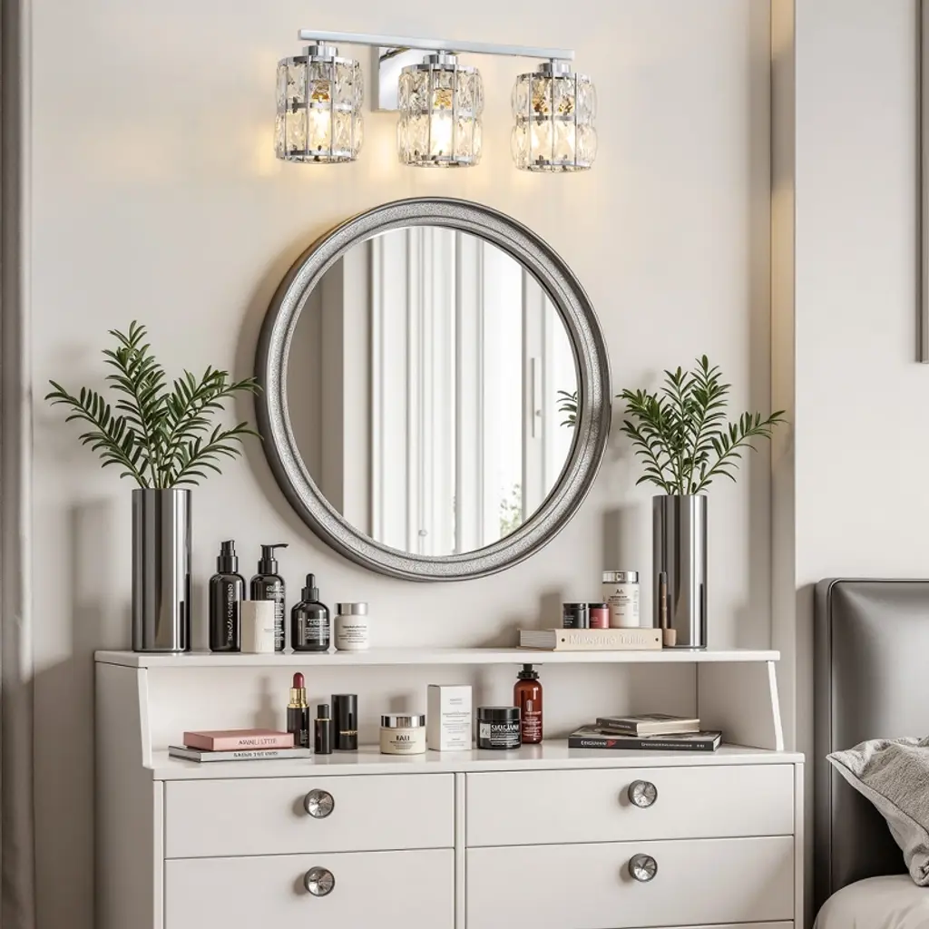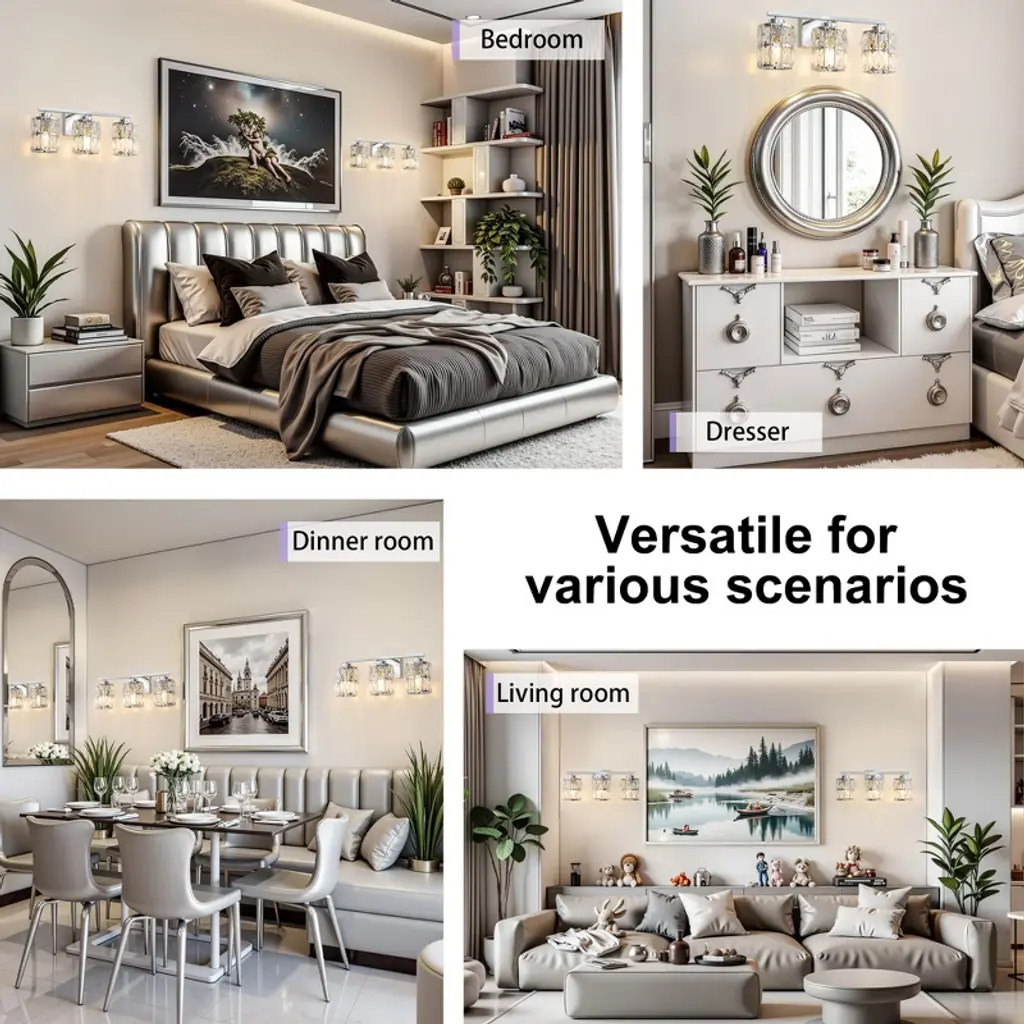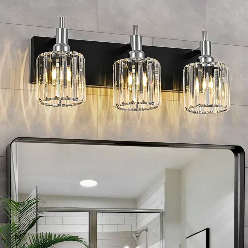 This modern bathroom light features a high-quality metal frame and stunning double-layer K9 crystal shades that create brilliant, sparkling refraction for a luxurious glow. The durable, rust-resistant metal construction ensures long-lasting performance in humid environments. Compatible with E26 bulbs (60W max, 110-120V), this UL-certified fixture offers versatile 360° illumination - install it facing up or down to suit your space. Fully dimmable when paired with compatible bulbs and switches (not included), it adds gorgeous, adjustable lighting to vanities, mirrors, or dressing areas. The sleek metal finish and exquisite crystal design blend effortlessly with contemporary, traditional, or transitional decor styles.