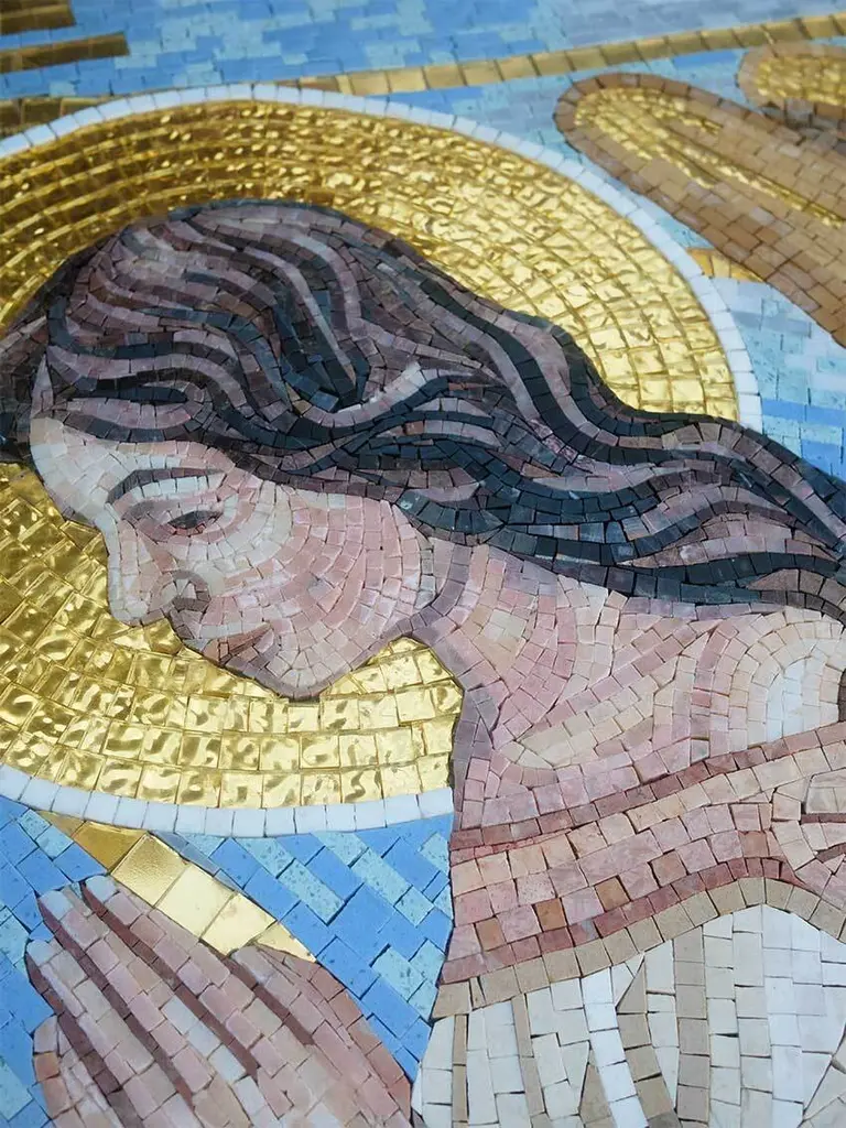 Discover "Celestial Serenity," an exquisite mosaic art piece featuring two kneeling angels in prayer, bathed in a radiant burst of golden light against a serene blue sky. Below them, stylized waves of blue and white marble tesserae represent tranquil waters or soft clouds. This stunning religious mosaic, meticulously crafted with small, varied tiles, evokes feelings of peace, hope, and divine grace. Perfect for spiritual spaces, homes seeking celestial beauty, or as a unique gift, this artwork captures the essence of faith and heavenly light. Ideal for SEO, keywords include: angel mosaic, religious art, spiritual decor, divine light art, Christian mosaic, celestial artwork, handmade mosaic, wall art, prayer art, biblical scenes, halo, golden rays, blue mosaic.