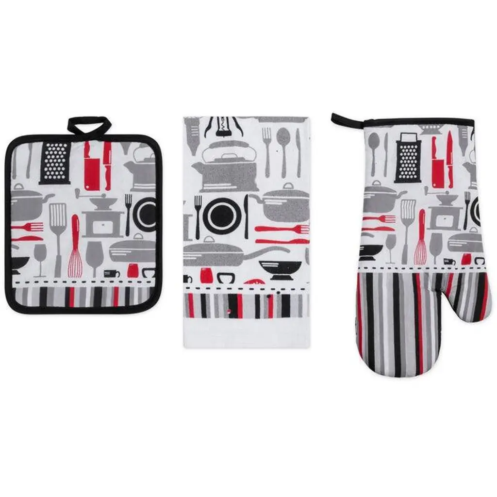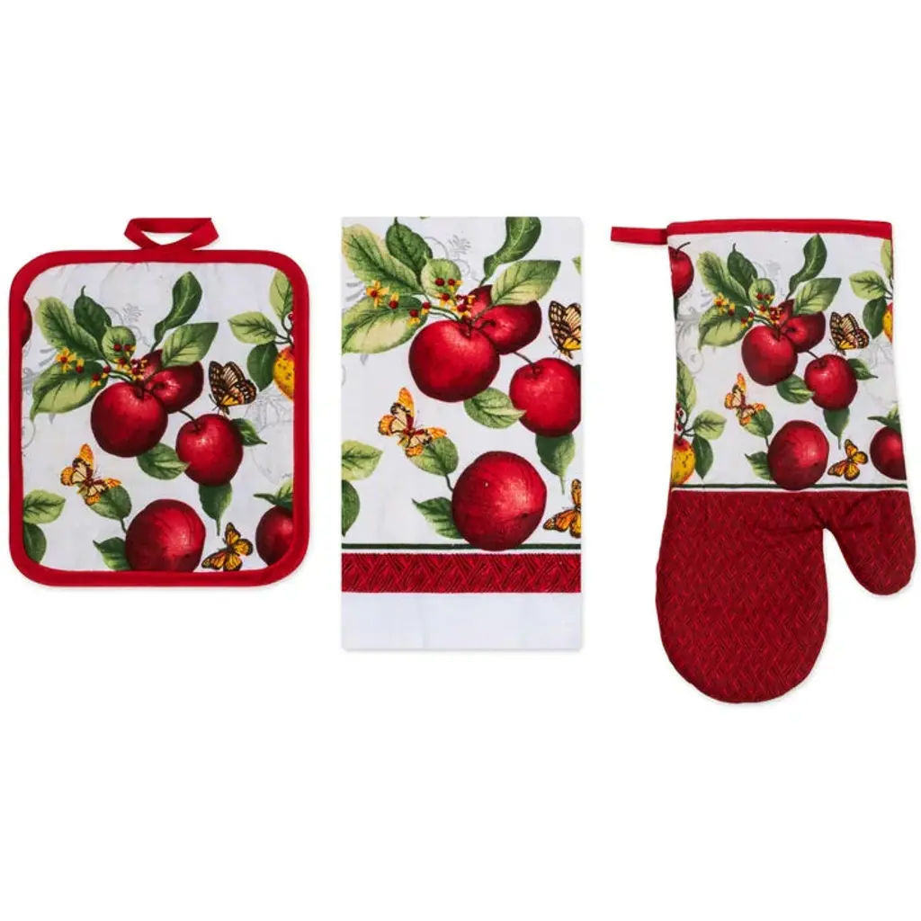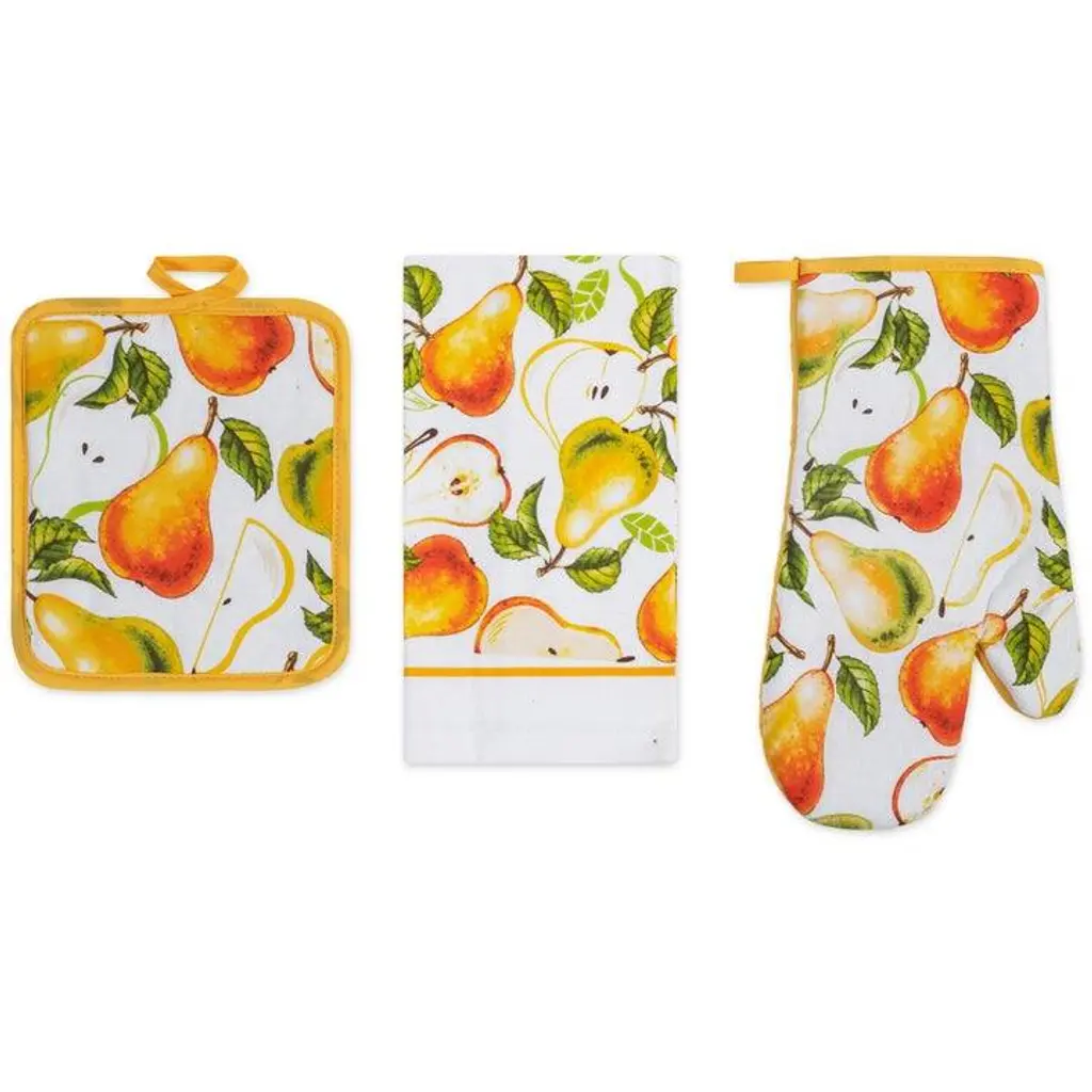 Spruce Up Your Kitchen with a PREMIUS 3-Piece Kitchen Linen Set!Ditch the mismatched mess and infuse your kitchen with personality and Style! This PREMIUS 3-piece kitchen linen set includes everything you need for culinary creations, all while boasting a design that speaks to you. All 3 pieces are meant to baking serving and of course clean up! Each Set comes with: 1 Oven Mitt, 1 Pot Holder, and 1 Cotton Towel.Super Absorbent Towel: This 100% cotton dish towel (15” x 25”) is soft, durable, and It's perfect for drying dishes, wiping up spills, or even tackling a greasy pan.Heat-Resistant Protection: The oven mitt (13”) and pot holder (7” x 8”) shield your hands from hot pots and pans. Cotton on the front provides a Vibrant design, while polyester on the back offers heat resistance.Express Yourself with These PREMIUS Designs: Pick your perfect fit from 15 fun and functional designs: Apple OrchardBicycle & SunflowersBaking ChefCoffee TimeCoffee CupGrandma's WhisksKitchen ToolsLemonOlive Oil & BranchOrangeOwlsPearsRoosterSunflowerWineEasy Care: Machine wash cold, tumble dry low, and iron on low for easy cleaning.Contents: 1 x 100% Cotton Kitchen Towel (15” x 25” Inches) 1 x Heat-Resistant Oven Mitt (13” Inches) 1 x Heat-Resistant Pot Holder (7” x 8” Inches) Upgrade your kitchen with this essential PREMIUS 3-piece kitchen linen set and say goodbye to mismatched dish towels and oven mitts and Pot Holder!