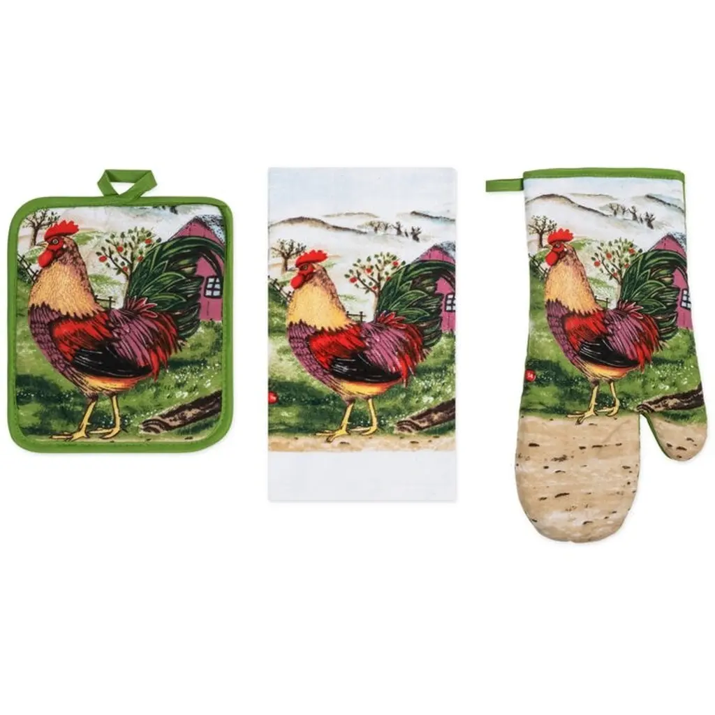 Spruce Up Your Kitchen with a PREMIUS 3-Piece Kitchen Linen Set!Ditch the mismatched mess and infuse your kitchen with personality and Style! This PREMIUS 3-piece kitchen linen set includes everything you need for culinary creations, all while boasting a design that speaks to you. All 3 pieces are meant to baking serving and of course clean up! Each Set comes with: 1 Oven Mitt, 1 Pot Holder, and 1 Cotton Towel.Super Absorbent Towel: This 100% cotton dish towel (15” x 25”) is soft, durable, and It's perfect for drying dishes, wiping up spills, or even tackling a greasy pan.Heat-Resistant Protection: The oven mitt (13”) and pot holder (7” x 8”) shield your hands from hot pots and pans. Cotton on the front provides a Vibrant design, while polyester on the back offers heat resistance.Express Yourself with These PREMIUS Designs: Pick your perfect fit from 15 fun and functional designs: Apple OrchardBicycle & SunflowersBaking ChefCoffee TimeCoffee CupGrandma's WhisksKitchen ToolsLemonOlive Oil & BranchOrangeOwlsPearsRoosterSunflowerWineEasy Care: Machine wash cold, tumble dry low, and iron on low for easy cleaning.Contents: 1 x 100% Cotton Kitchen Towel (15” x 25” Inches) 1 x Heat-Resistant Oven Mitt (13” Inches) 1 x Heat-Resistant Pot Holder (7” x 8” Inches) Upgrade your kitchen with this essential PREMIUS 3-piece kitchen linen set and say goodbye to mismatched dish towels and oven mitts and Pot Holder!