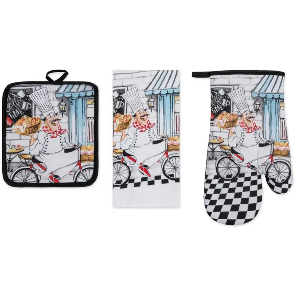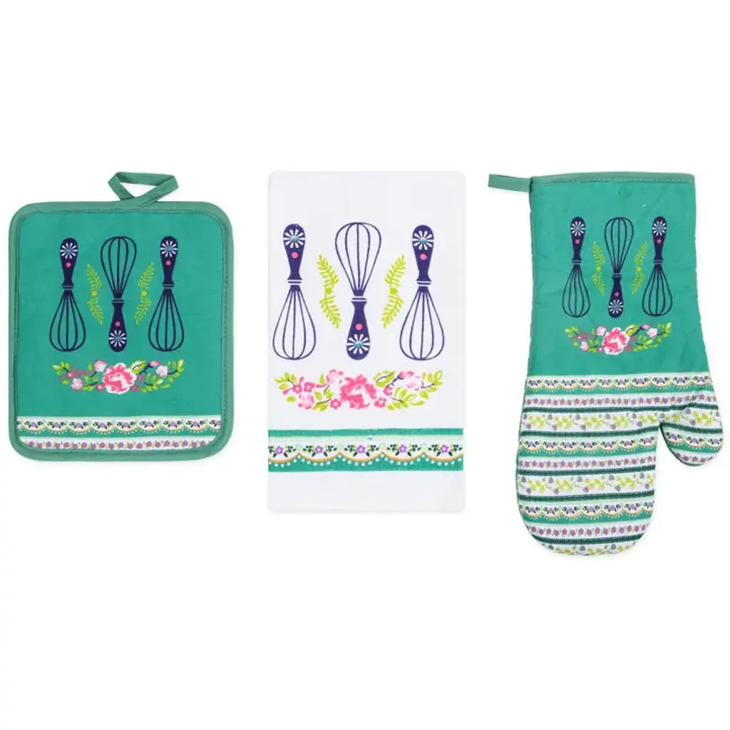 Spruce Up Your Kitchen with a PREMIUS 3-Piece Kitchen Linen Set!Ditch the mismatched mess and infuse your kitchen with personality and Style! This PREMIUS 3-piece kitchen linen set includes everything you need for culinary creations, all while boasting a design that speaks to you. All 3 pieces are meant to baking serving and of course clean up! Each Set comes with: 1 Oven Mitt, 1 Pot Holder, and 1 Cotton Towel.Super Absorbent Towel: This 100% cotton dish towel (15” x 25”) is soft, durable, and It's perfect for drying dishes, wiping up spills, or even tackling a greasy pan.Heat-Resistant Protection: The oven mitt (13”) and pot holder (7” x 8”) shield your hands from hot pots and pans. Cotton on the front provides a Vibrant design, while polyester on the back offers heat resistance.Express Yourself with These PREMIUS Designs: Pick your perfect fit from 15 fun and functional designs: Apple OrchardBicycle & SunflowersBaking ChefCoffee TimeCoffee CupGrandma's WhisksKitchen ToolsLemonOlive Oil & BranchOrangeOwlsPearsRoosterSunflowerWineEasy Care: Machine wash cold, tumble dry low, and iron on low for easy cleaning.Contents: 1 x 100% Cotton Kitchen Towel (15” x 25” Inches) 1 x Heat-Resistant Oven Mitt (13” Inches) 1 x Heat-Resistant Pot Holder (7” x 8” Inches) Upgrade your kitchen with this essential PREMIUS 3-piece kitchen linen set and say goodbye to mismatched dish towels and oven mitts and Pot Holder!