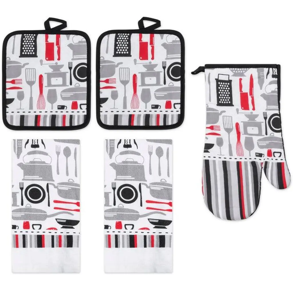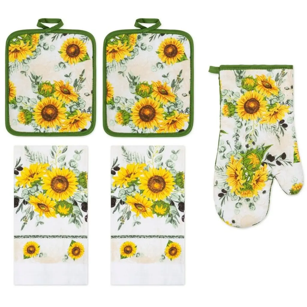Premius 5 Piece Printed Kitchen Linen Set, 2 Cotton Towels, 2 Pot Holders, 1 Oven Mitt - Bicycle & Sunflowers