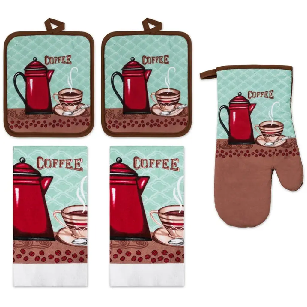 Spruce Up Your Kitchen with a PREMIUS 5-Piece Kitchen Linen Set!Ditch the mismatched mess and infuse your kitchen with personality and style! This PREMIUS 5-piece set includes everything you need to tackle any culinary creation, all while boasting a design that reflects your unique taste. All 5 pieces are meant to baking serving and of course clean up! Each Set comes with: 1 Oven Mitt, 2 Pot Holder, and 2 Cotton Towels.Super Absorbent Towel: This 100% cotton dish towel (15” x 25”) is soft, durable, and It's perfect for drying dishes, wiping up spills, or even tackling a greasy pan.Heat-Resistant Protection: The oven mitt (13”) and two pot holders (7” x 8”) shield your hands from scorching hot pots and pans. The cotton front provides a comfortable grip, letting you maneuver cookware with confidence, while the polyester back offers an extra layer of heat resistance for ultimate protection.Express Yourself with These 15 PREMIUS Designs: Pick your perfect fit from a variety of fun and functional designs to match your kitchen décor. There's a design to match every kitchen and personality!Apple OrchardBicycle & SunflowersBaking ChefCoffee TimeCoffee CupGrandma's WhisksKitchen ToolsLemonOlive Oil & BranchOrangeOwlsPearsRoosterSunflowerWineContents:2 x 100% Cotton Kitchen Towels (15” x 25” Inches)1 x Heat-Resistant Oven Mitt (13” Inches)2 x Heat-Resistant Pot Holders (7” x 8” Inches)Easy Care: Machine wash cold, tumble dry low, and iron on low for hassle-free cleaning.Upgrade your kitchen with this essential PREMIUS 5-piece set and say goodbye to mismatched dish towels, oven mitts and pot holders!