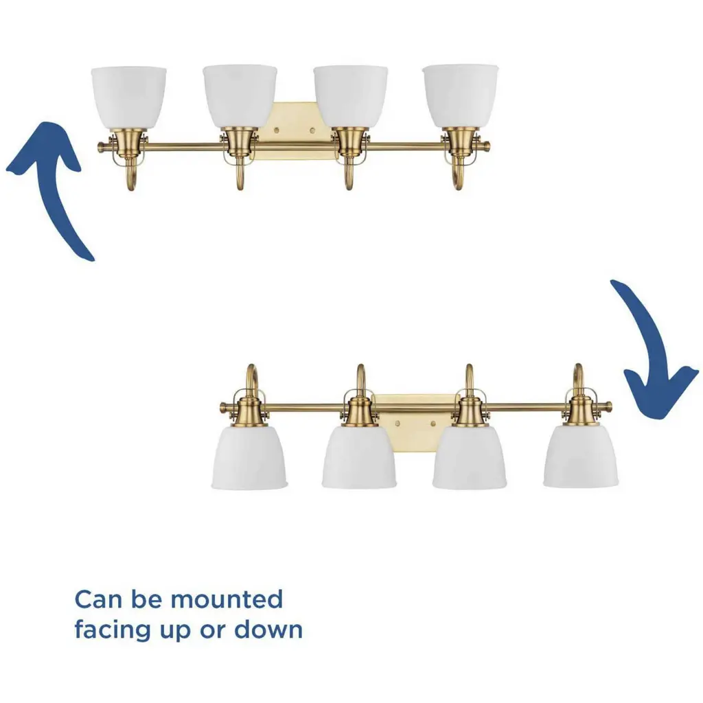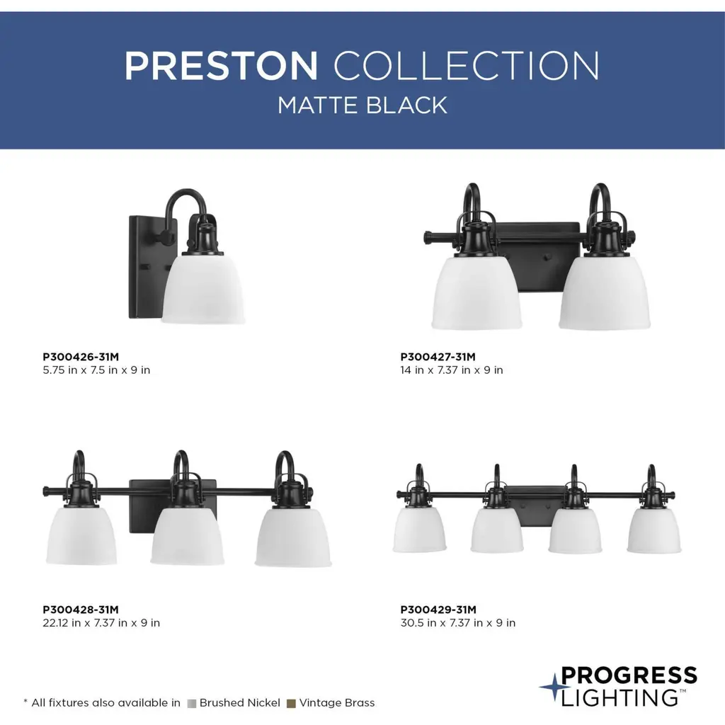 Preston features industrial inspired details paired with elegant opal glass for comfortable illumination in the bath, and fits beautifully into farmhouse, coastal and transitional settings. The decorative frame includes a softly curved metal support with authentically crafted hardware elements.