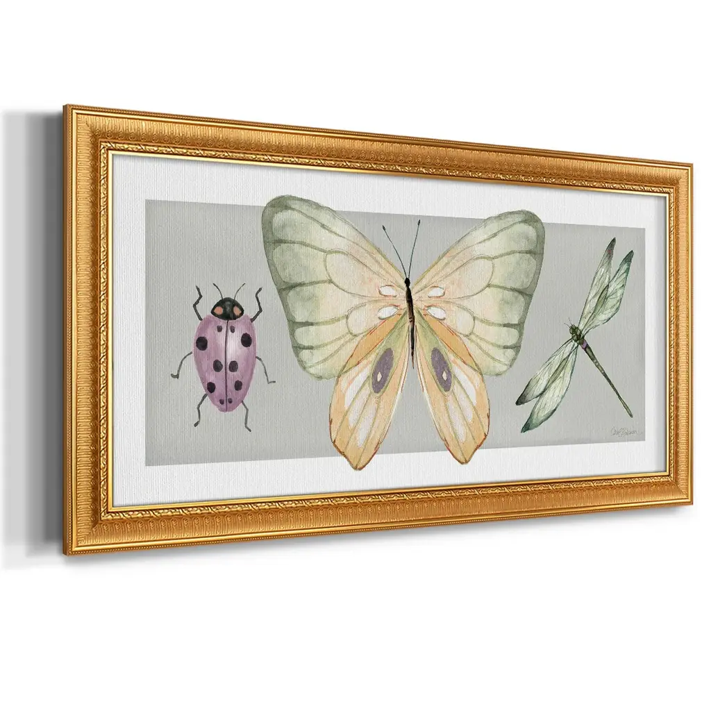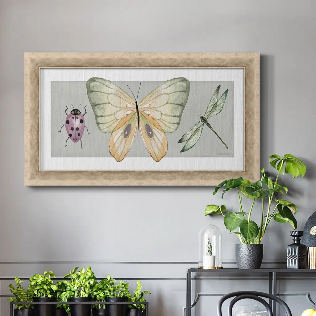 Pretty Insects I Premium Framed Canvas- Ready to Hang A Premium Framed Canvas created to last. Framed in distressed wood and available in an array of sizes and colors Featuring a beveled a solid wood stretcher bar, each piece comes ready to hand 3 SIZES AVAILABLE 21''X37'' - Overall Size 25''X45'' - Overall Size 29''x53'' - Overall Size Each piece is made to order. Each piece comes with hanging hardware. Made in the USA Ready to Hang Giclee Paper Print Acrylic Glass Beveled Matt Board