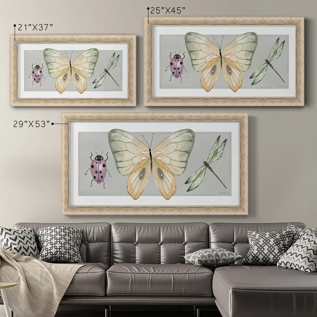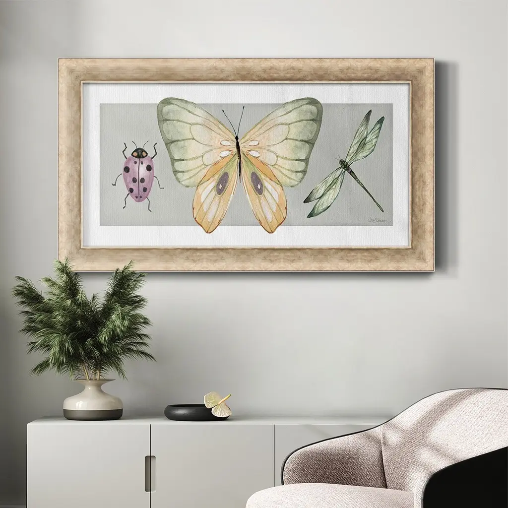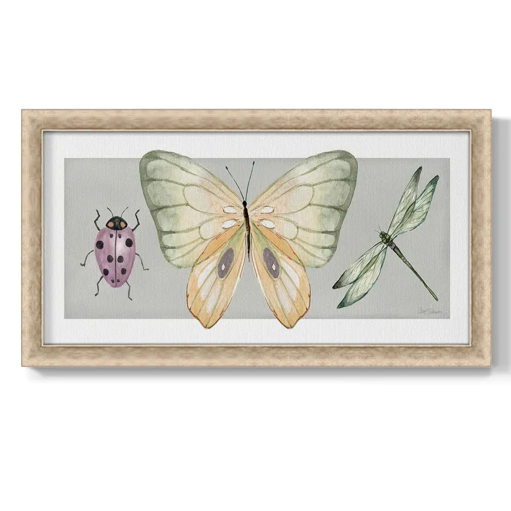 Pretty Insects I Premium Framed Canvas- Ready to Hang A Premium Framed Canvas created to last. Framed in distressed wood and available in an array of sizes and colors Featuring a beveled a solid wood stretcher bar, each piece comes ready to hand 3 SIZES AVAILABLE 21''X37'' - Overall Size 25''X45'' - Overall Size 29''x53'' - Overall Size Each piece is made to order. Each piece comes with hanging hardware. Made in the USA Ready to Hang Giclee Paper Print Acrylic Glass Beveled Matt Board