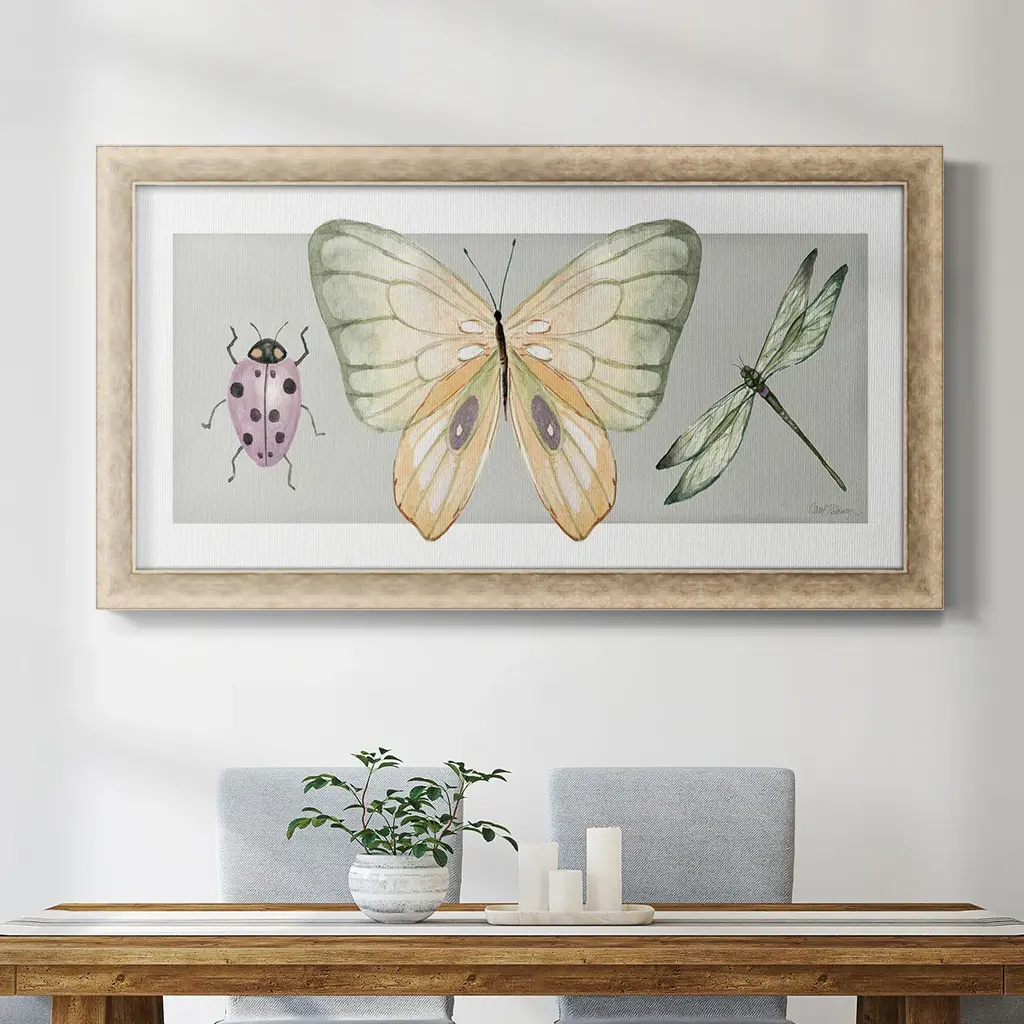 Pretty Insects I Premium Framed Canvas- Ready to Hang A Premium Framed Canvas created to last. Framed in distressed wood and available in an array of sizes and colors Featuring a beveled a solid wood stretcher bar, each piece comes ready to hand 3 SIZES AVAILABLE 21''X37'' - Overall Size 25''X45'' - Overall Size 29''x53'' - Overall Size Each piece is made to order. Each piece comes with hanging hardware. Made in the USA Ready to Hang Giclee Paper Print Acrylic Glass Beveled Matt Board