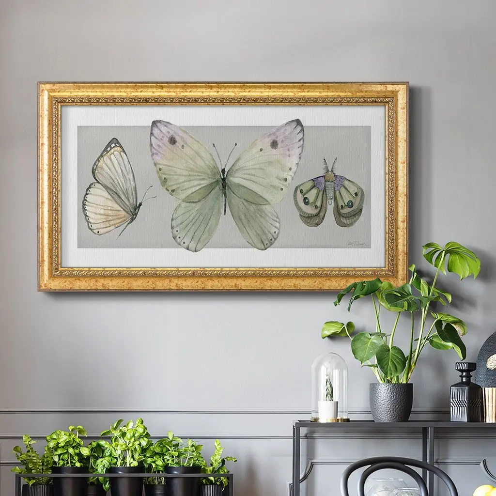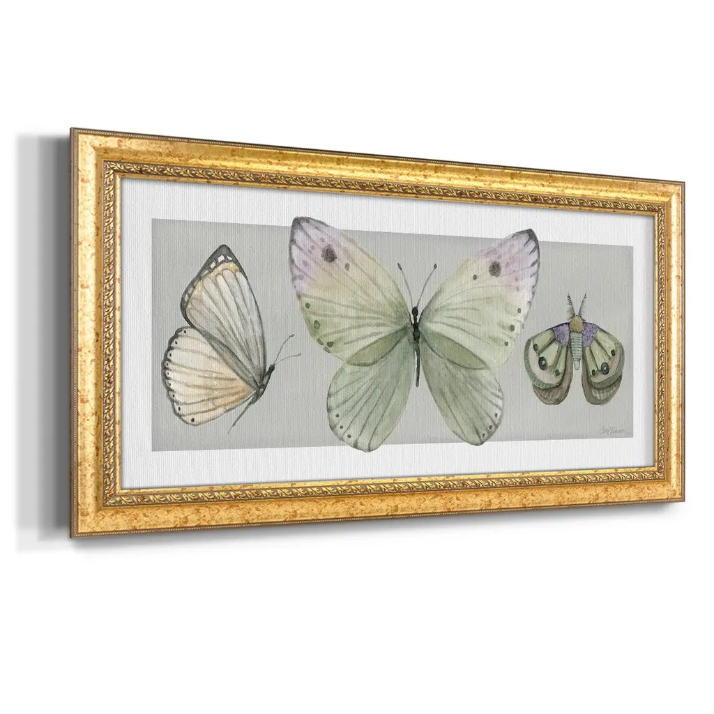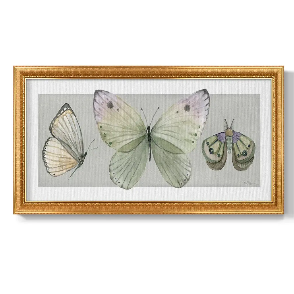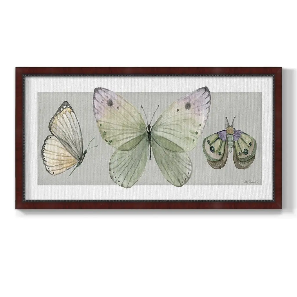 Pretty Insects II Premium Framed Canvas- Ready to Hang A Premium Framed Canvas created to last. Framed in distressed wood and available in an array of sizes and colors Featuring a beveled a solid wood stretcher bar, each piece comes ready to hand 3 SIZES AVAILABLE 21''X37'' - Overall Size 25''X45'' - Overall Size 29''x53'' - Overall Size Each piece is made to order. Each piece comes with hanging hardware. Made in the USA Ready to Hang Giclee Paper Print Acrylic Glass Beveled Matt Board
