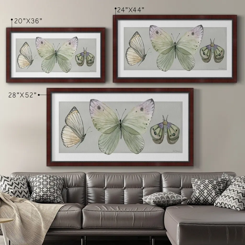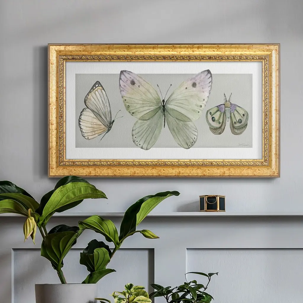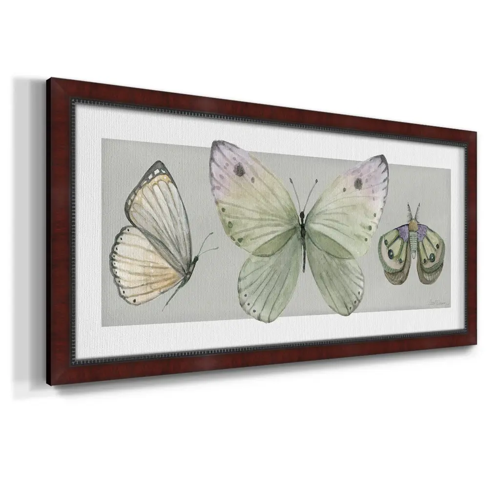 Pretty Insects II Premium Framed Canvas- Ready to Hang A Premium Framed Canvas created to last. Framed in distressed wood and available in an array of sizes and colors Featuring a beveled a solid wood stretcher bar, each piece comes ready to hand 3 SIZES AVAILABLE 21''X37'' - Overall Size 25''X45'' - Overall Size 29''x53'' - Overall Size Each piece is made to order. Each piece comes with hanging hardware. Made in the USA Ready to Hang Giclee Paper Print Acrylic Glass Beveled Matt Board