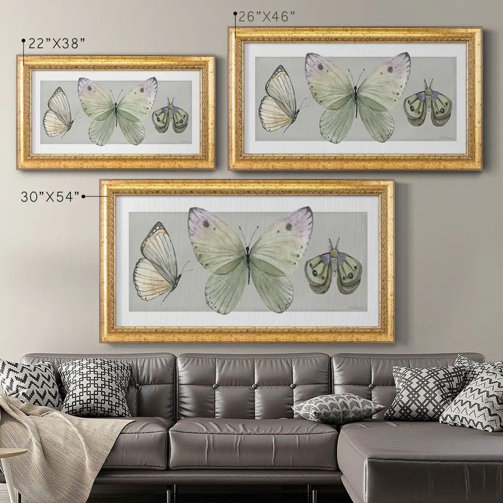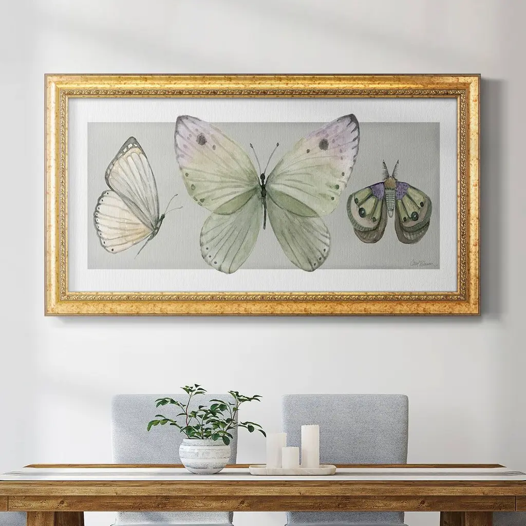 Pretty Insects II Premium Framed Canvas- Ready to Hang A Premium Framed Canvas created to last. Framed in distressed wood and available in an array of sizes and colors Featuring a beveled a solid wood stretcher bar, each piece comes ready to hand 3 SIZES AVAILABLE 21''X37'' - Overall Size 25''X45'' - Overall Size 29''x53'' - Overall Size Each piece is made to order. Each piece comes with hanging hardware. Made in the USA Ready to Hang Giclee Paper Print Acrylic Glass Beveled Matt Board