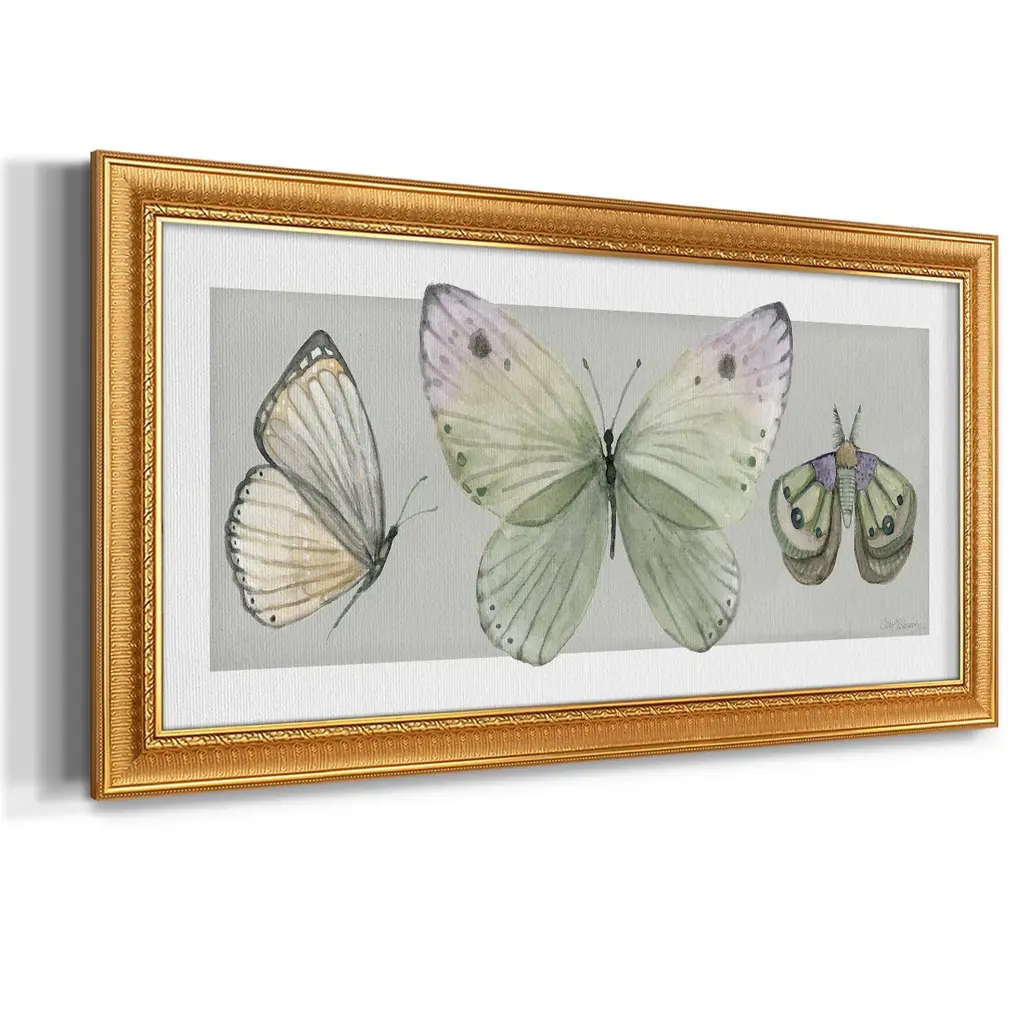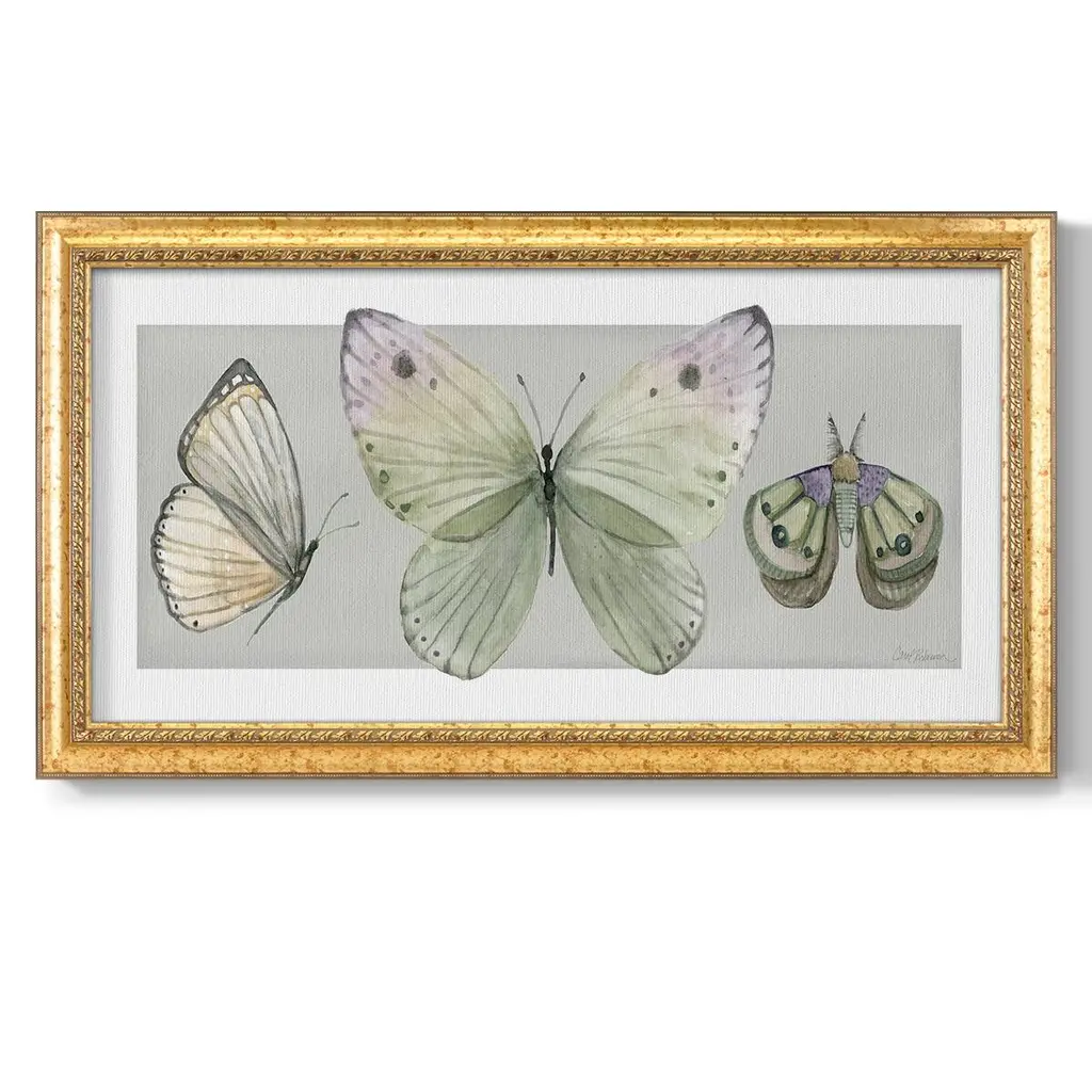 Pretty Insects II Premium Framed Canvas- Ready to Hang A Premium Framed Canvas created to last. Framed in distressed wood and available in an array of sizes and colors Featuring a beveled a solid wood stretcher bar, each piece comes ready to hand 3 SIZES AVAILABLE 21''X37'' - Overall Size 25''X45'' - Overall Size 29''x53'' - Overall Size Each piece is made to order. Each piece comes with hanging hardware. Made in the USA Ready to Hang Giclee Paper Print Acrylic Glass Beveled Matt Board