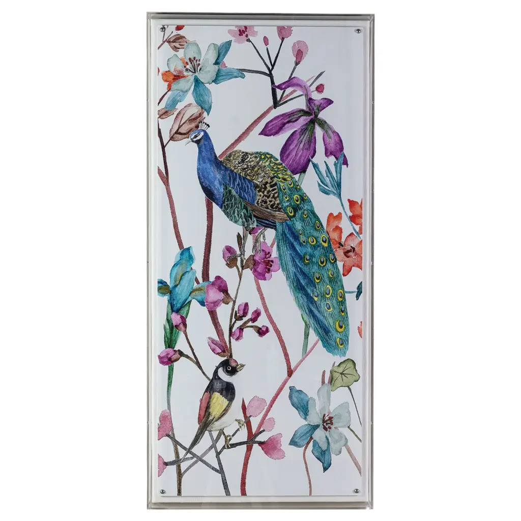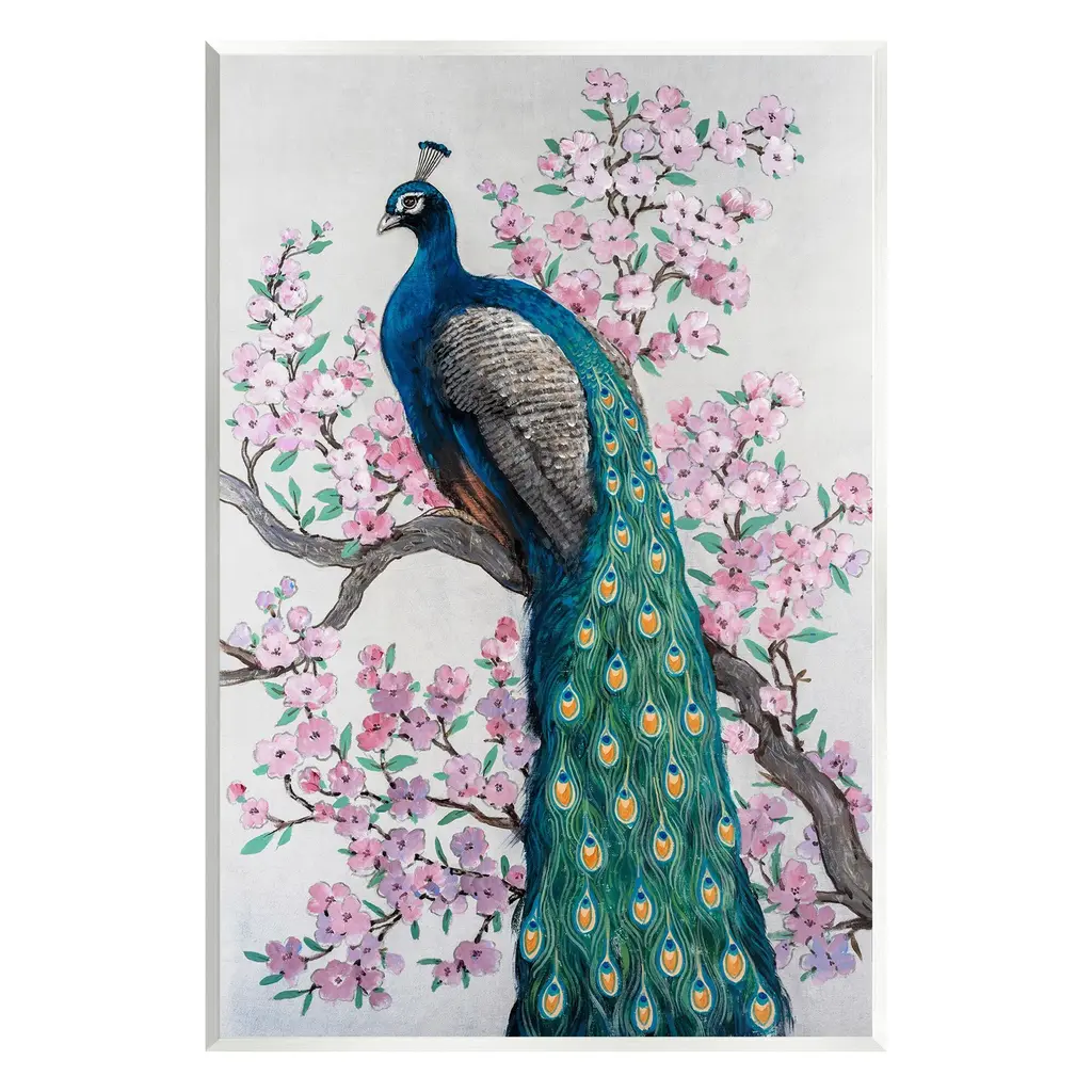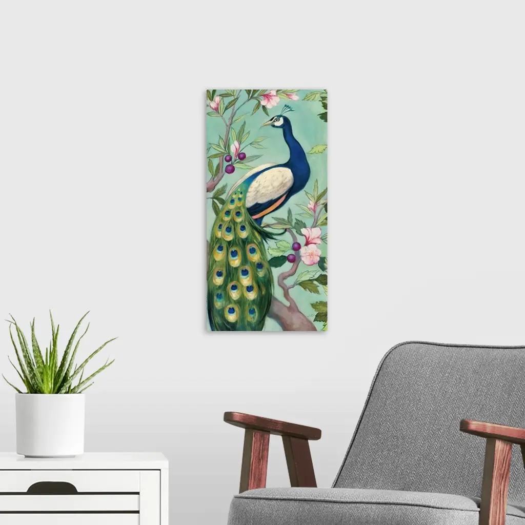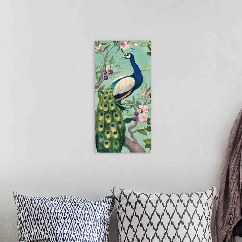 Large vertical contemporary painting of peacock perched on a tree branch with colorful berries and blooms nearby.