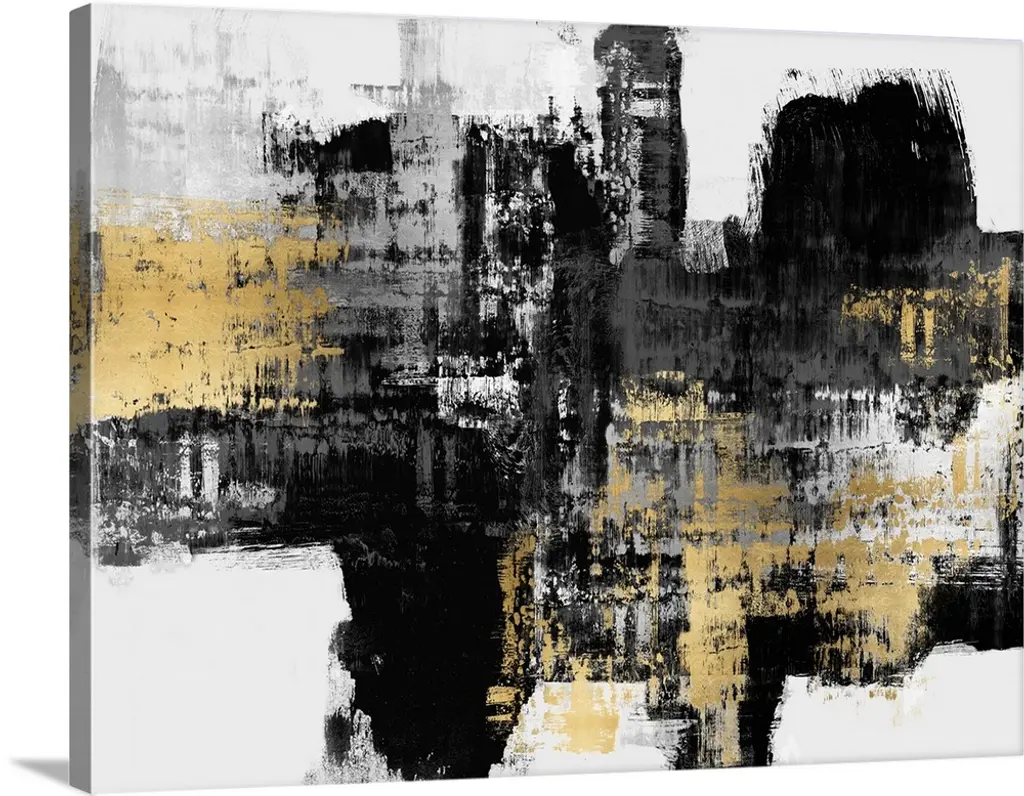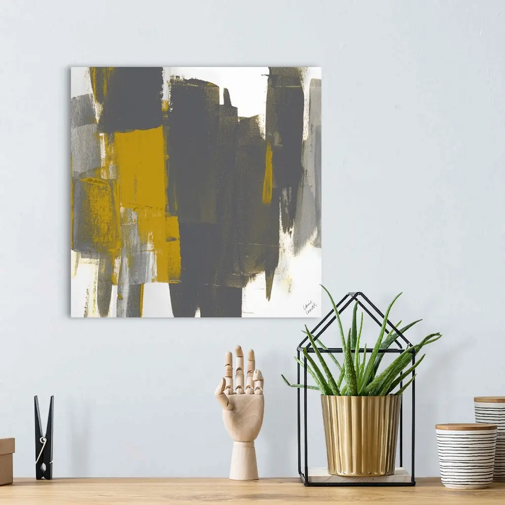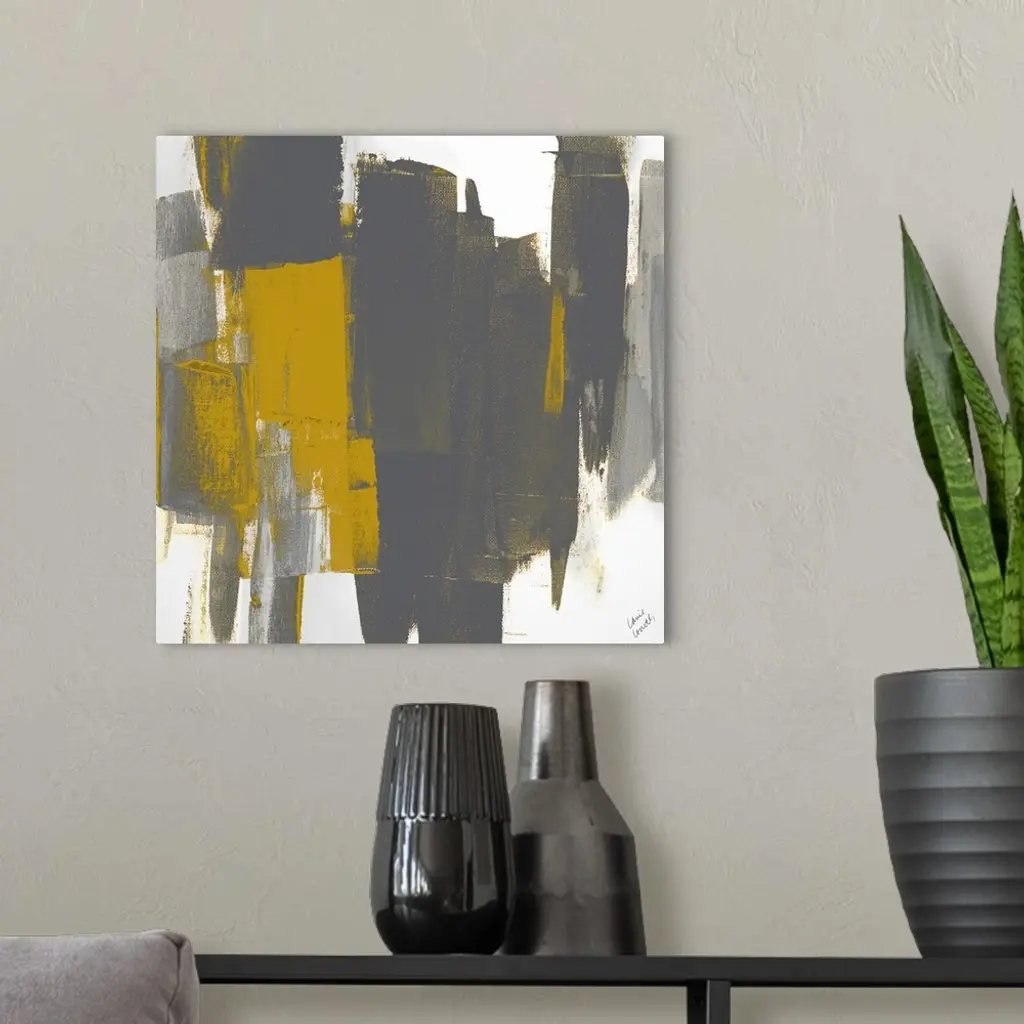 Square abstract painting with wide vertical brushstrokes in shades of gray and deep yellow.