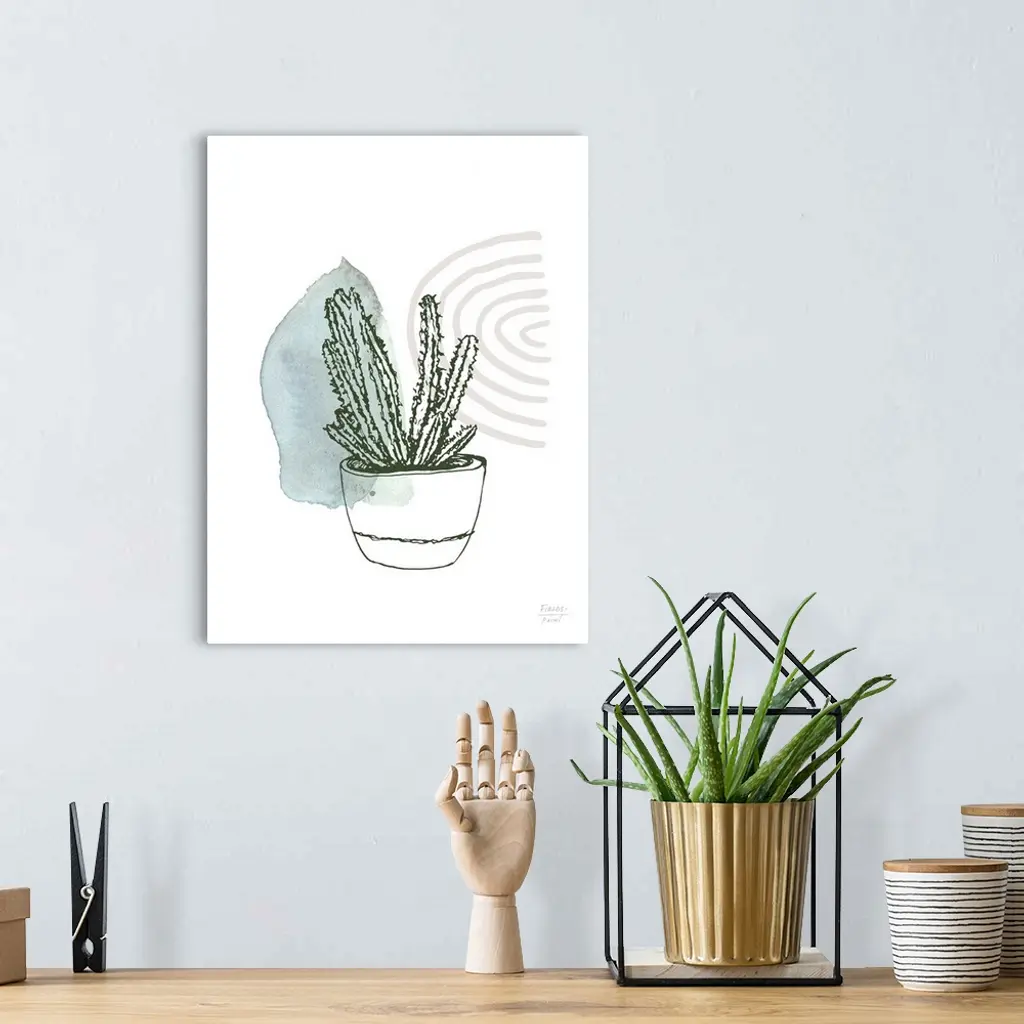 Watercolor and ink painting of a potted succulent plant.