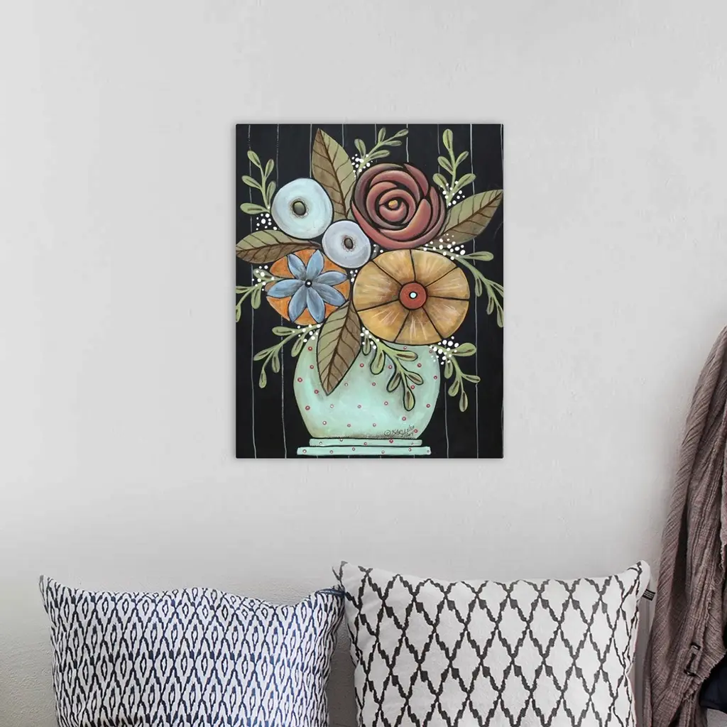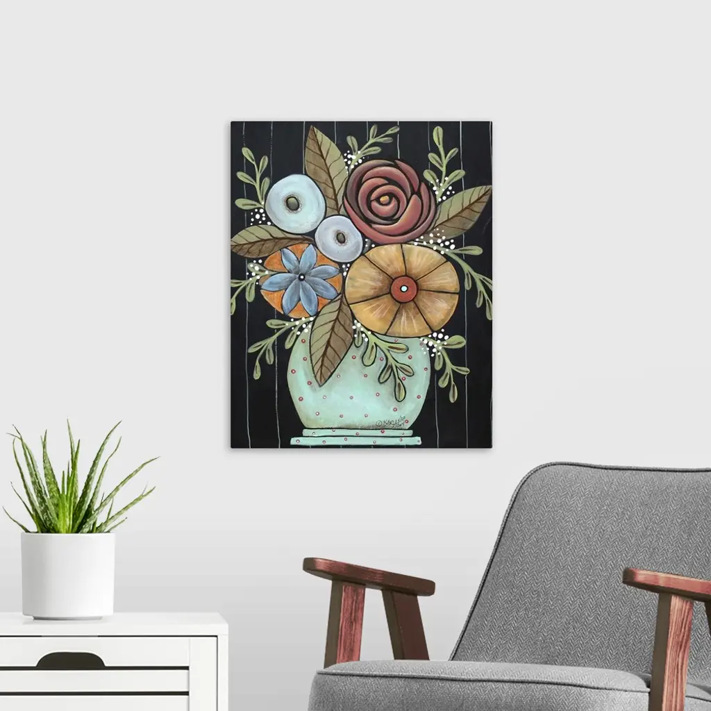 Contemporary painting of a vase of colorful flowers, including a rose, against a black background.