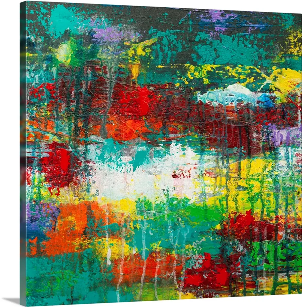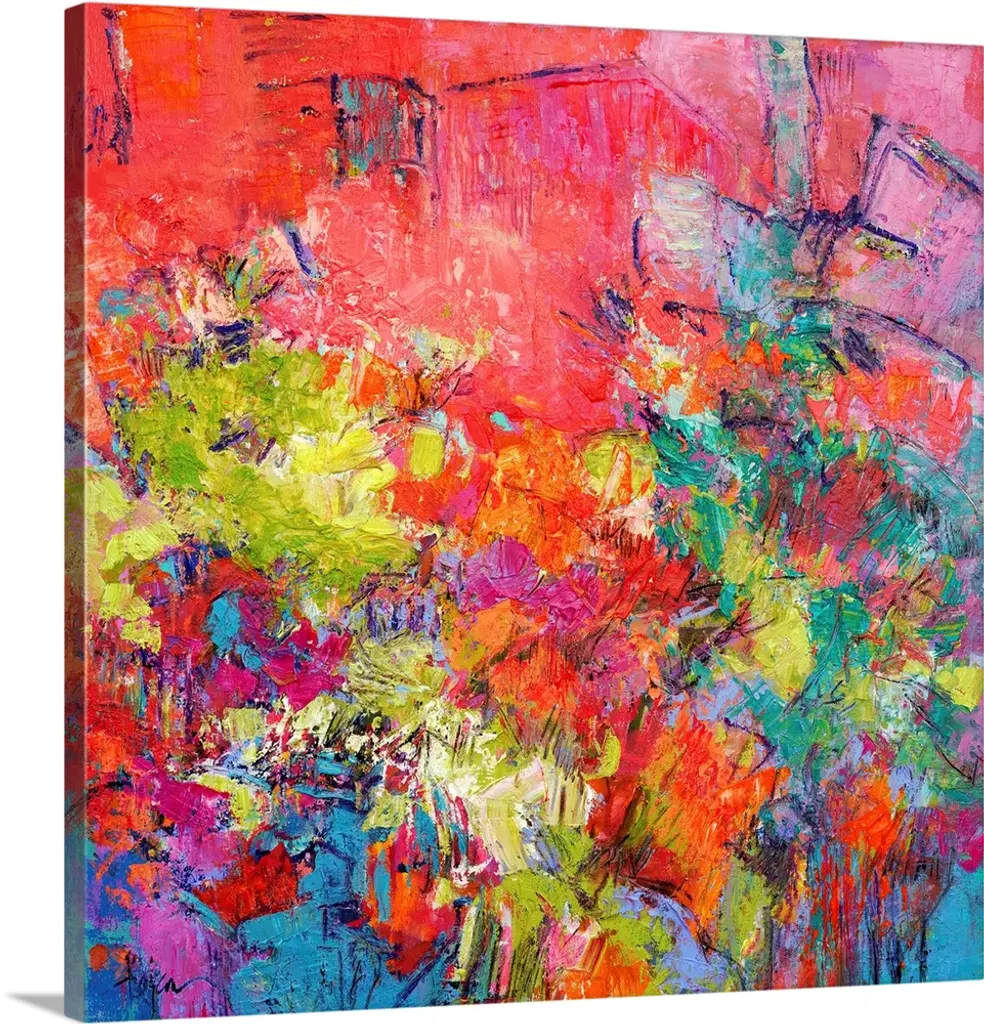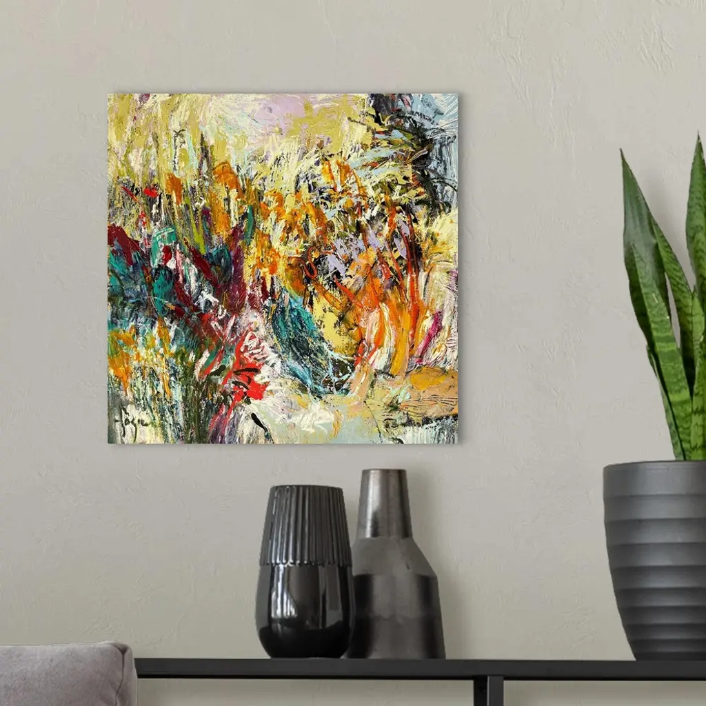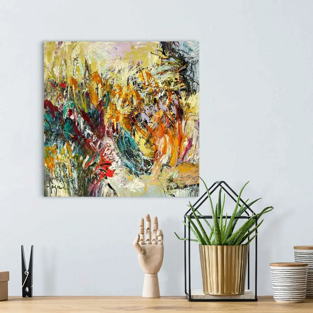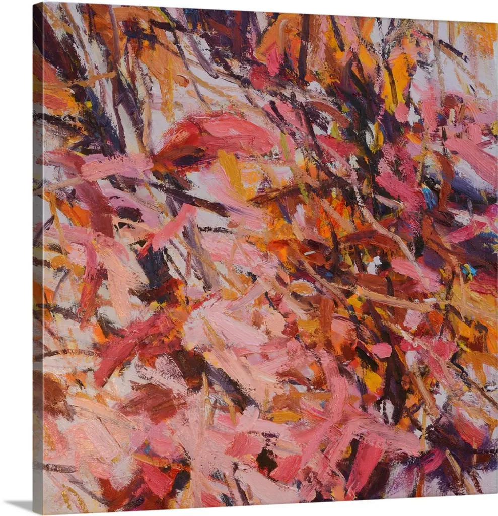A lively contemporary abstract painting in warm fall shades of orange and teal