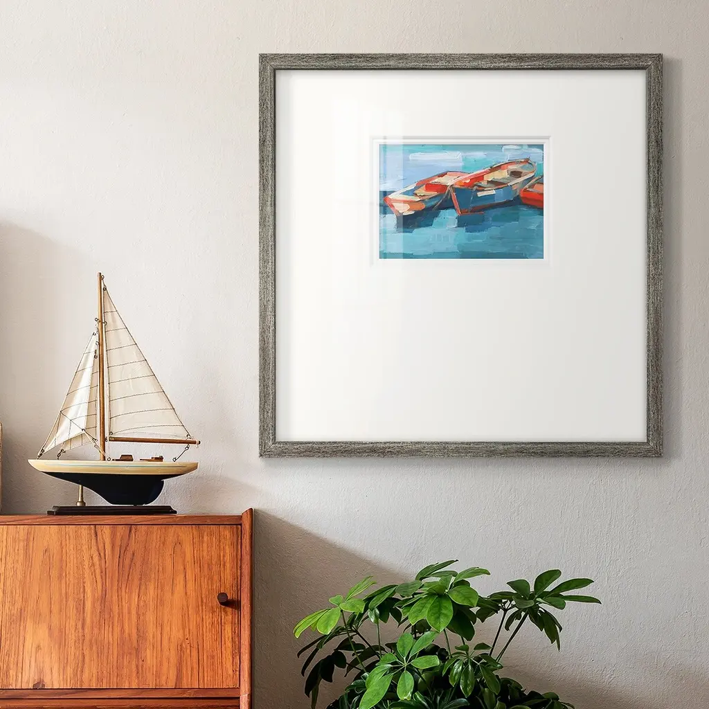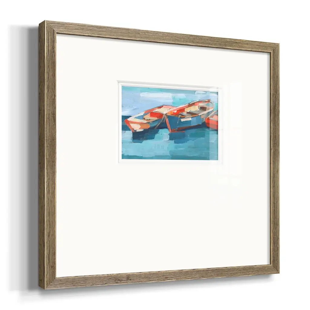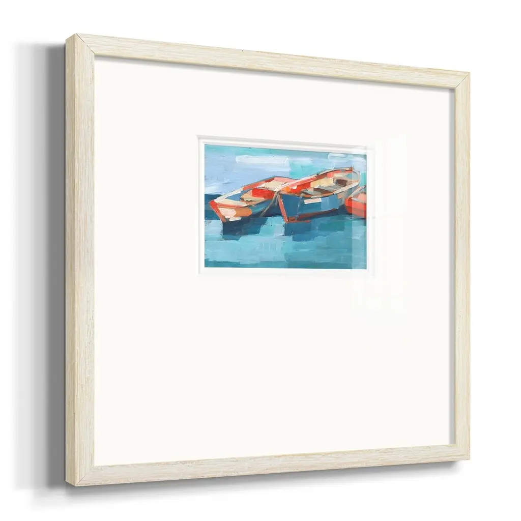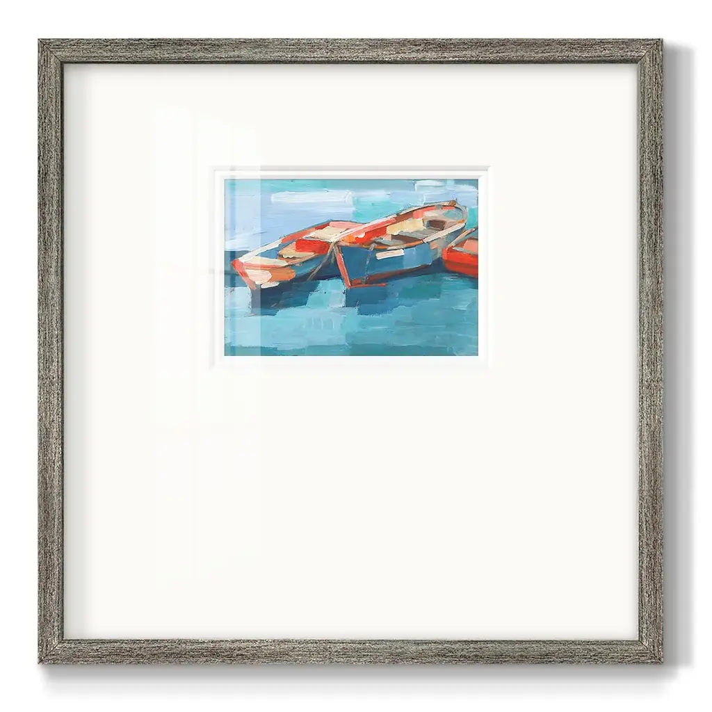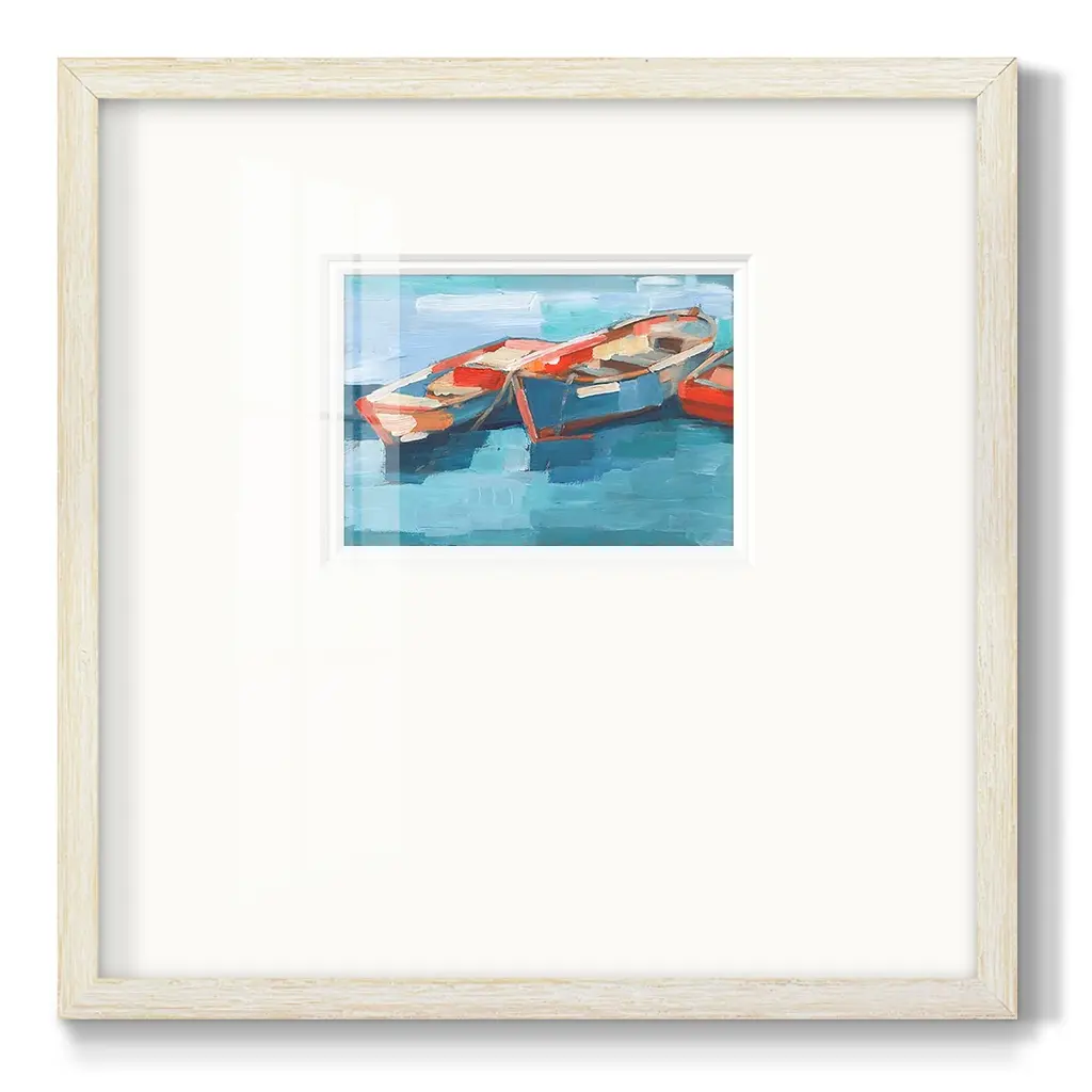 Primary Boats IPremium Framed Print A framed cold pressed paper print featuring superior double matting and quality frame. 2 SIZES AVAILABLE 16''X16''' - Overall Size 20''X20''' - Overall Size Each piece is made to order. Each piece comes with hanging hardware. Made in the USA Ready to Hang Giclee Paper Print Plexiglass Beveled Matt Board Double Matte Board